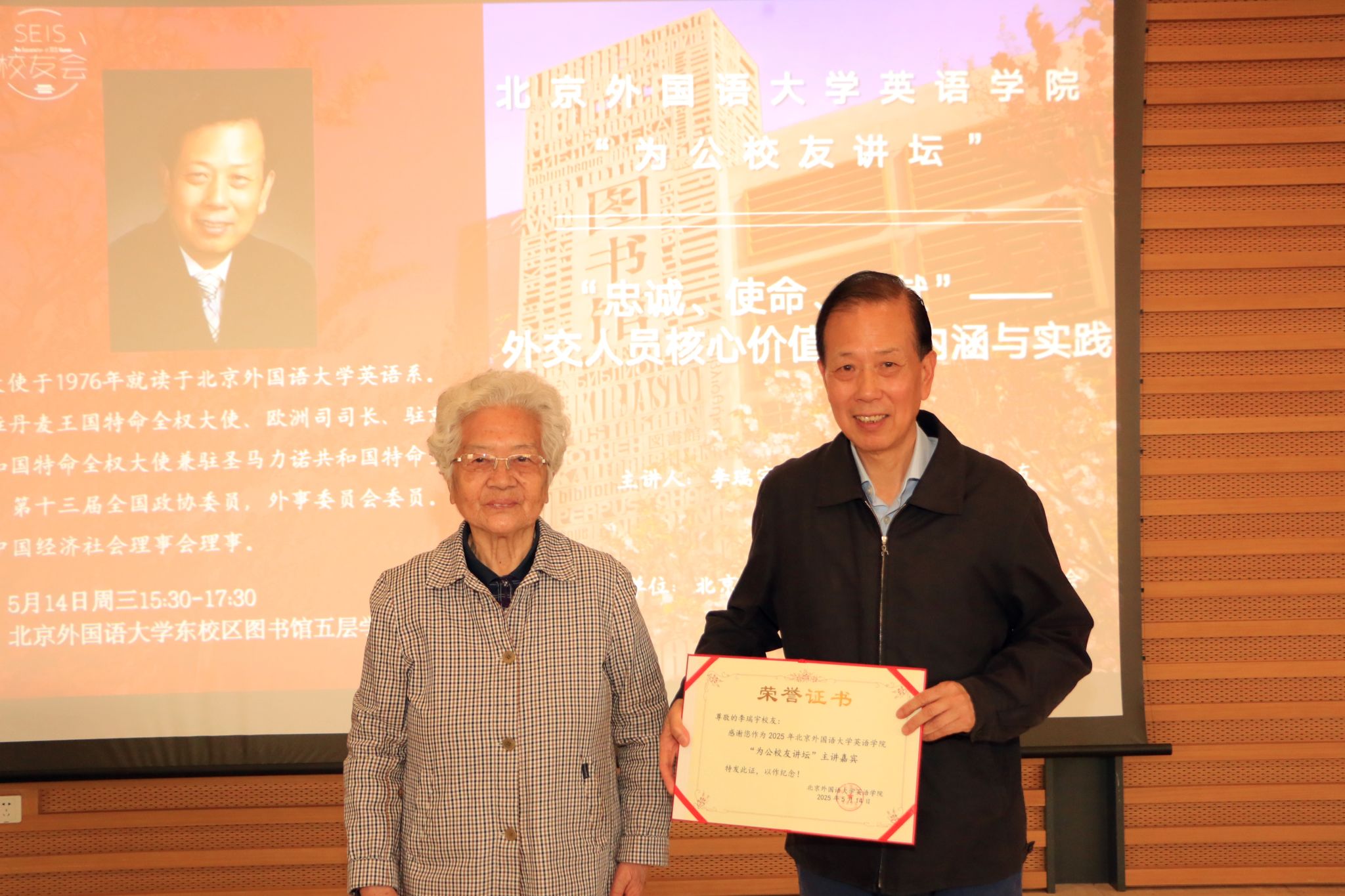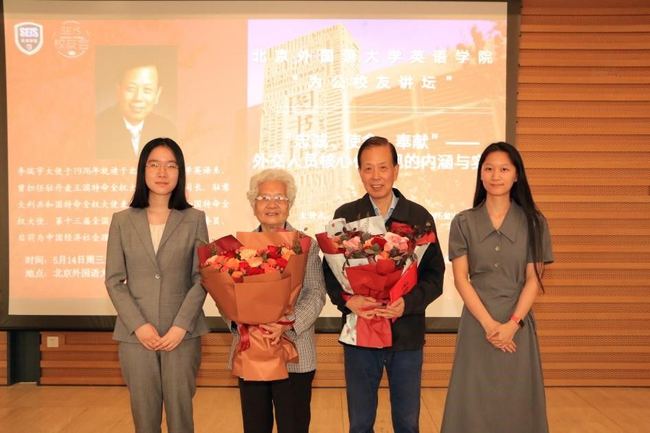 讲座最后,陈乃芳为李大使颁发了“为公校友讲坛”证书,现场同学为两位前辈献上鲜花并合影留念。