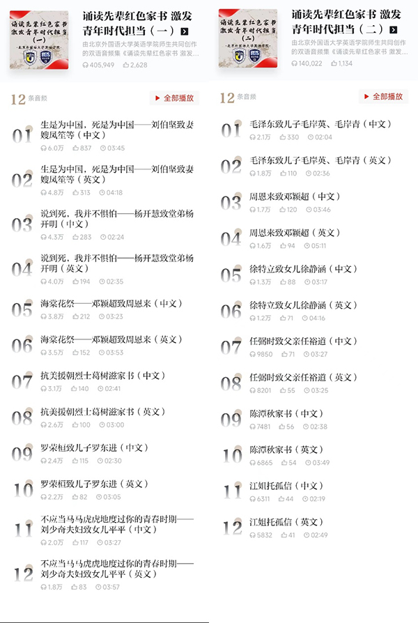 为深入推进学习贯彻习近平新时代中国特色社会主义思想主题教育,践行习近平总书记给北外老教授的重要回信精神,2023年5月,米兰milan官方网站党总支与“学习强国”学习平台联合推出外语诵读专栏《诵读先辈红色家书 激发青年时代担当》,为听众带来中英双语家书朗诵。朗读内容取材自十二篇家书,主题各异,涵盖反哺义、雎鸠缘、手足亲、舐犊情、至亲情等,重现了毛泽东、周恩来、杨开慧等中国先辈在不同时期闪耀的理想信念之光。5月22日和12月8日,两期共24条双语音频分别在“学期强国-强国之声-大学生朗读”频道正式上线,收获近55万播放量和千余条点赞量。