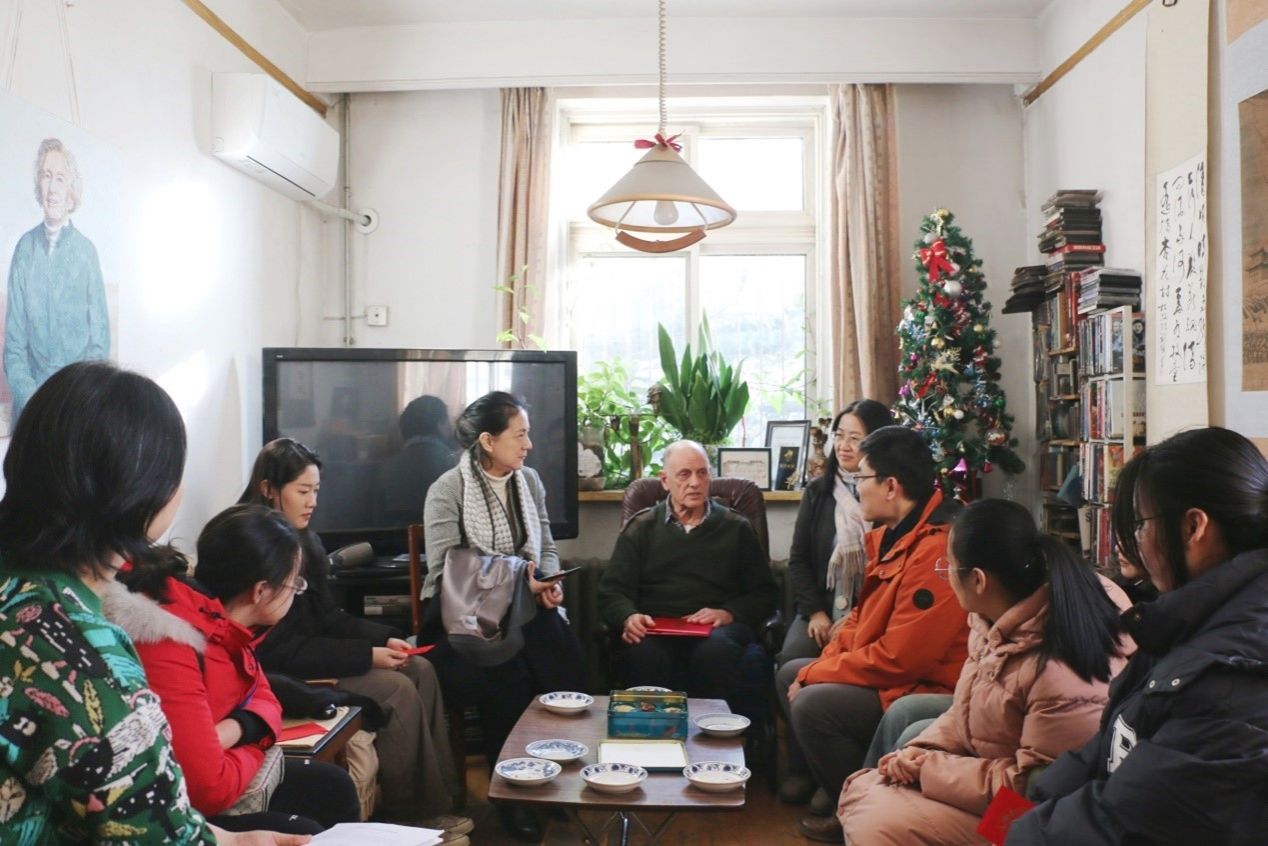 随后师生一行移步到西院,沿着“伊莎白小道”来到了其故居。柯马凯先生亲自为获奖的五位学生手写祝福语、发放奖学金红包。他与获奖学生深入交流,了解学生学习情况、家乡特色、未来规划,讲述了柯鲁克夫妇生平及奖学金设立的背景。他说,其父母原本立志要做一名记者及人类学家,但在中国外语教育需要他们支持的时候,他们毅然决然的投入到中国外语教育事业中,一干就是一辈子。虽然条件艰苦,但是他们乐在其中,“得意”于在北外的工作与生活。