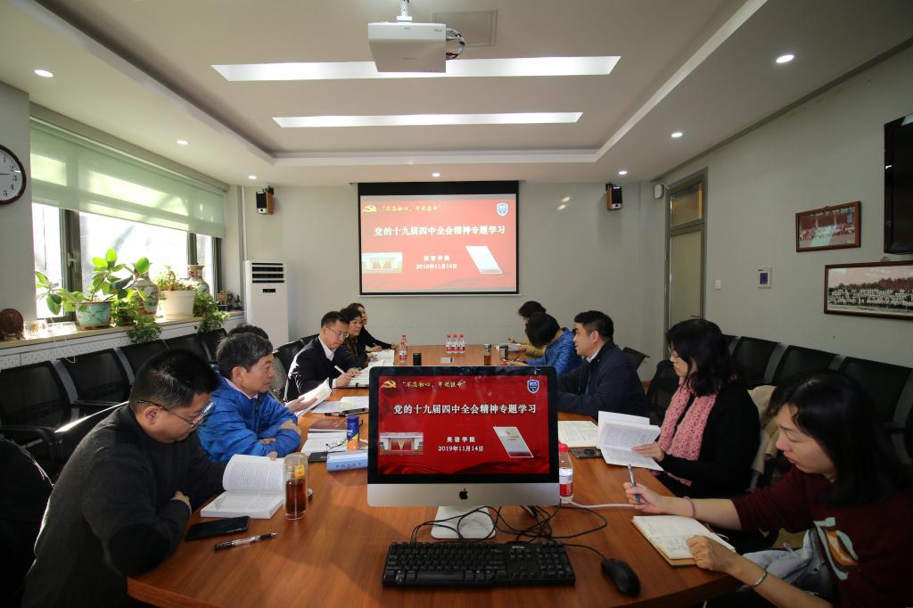 11月14日下午,米兰milan官方网站理论中心组召开党的十九届四中全会精神专题学习讨论会,交流分享学习党的十九届四中全会精神的认识和体会。学院班子全体成员、党总支委员和教工党支部书记参加学习研讨。会议由党总支书记路兴主持。参会人员会前结合实际研读了学校党委下发的《党的十九届四中全会<决定>学习辅导百问》。