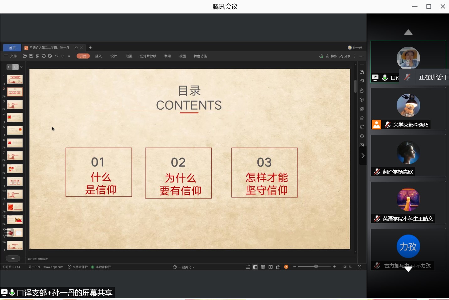 随后,口译支部的孙一丹、方梦雨两位同志结合第二集内容,系统形象地分析了信仰的力量。两位同志表示,通过观看学习,她们深刻领会了信仰的重要性。正是因为有了坚定的理想信念,无论是弱小还是强大,无论是顺境还是逆境,我们党都初心不改、矢志不渝,团结带领人民历经千难万险,付出巨大牺牲,敢于面对曲折,勇于修正错误,攻克了一个又一个看似不可攻克的难关,创造了一个又一个彪炳史册的人间奇迹。而身为党员唯有紧密团结在以习近平同志为核心的党中央周围,不忘初心,牢记使命,努力奋斗,才能实现为中国人民谋幸福,为中华民族谋复兴。