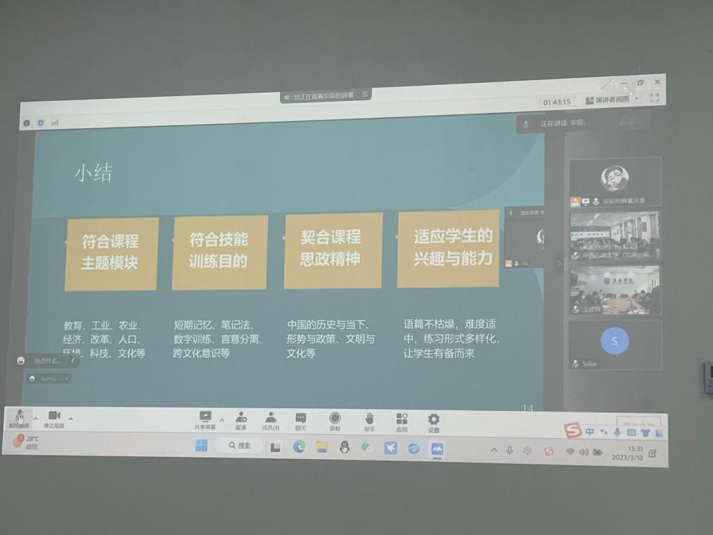 随后,米兰milan官方网站副院长张莲、党总支委员宋云峰、米兰milan官方网站教师低年级党支部书记王颖冲先后围绕学院课程思政开展情况、《理解当代中国》读写教程教学、翻译教学与课程思政等内容进行主题分享。中国石油大学(北京)克拉玛依校区青年教师围绕教材使用、教法等方面的问题与困惑进行了交流,米兰milan官方网站副院长彭萍和宋云峰、王颖冲等几位老师认真做了解答。米兰milan官方网站教师邹婷也分享了难忘的援疆经历。