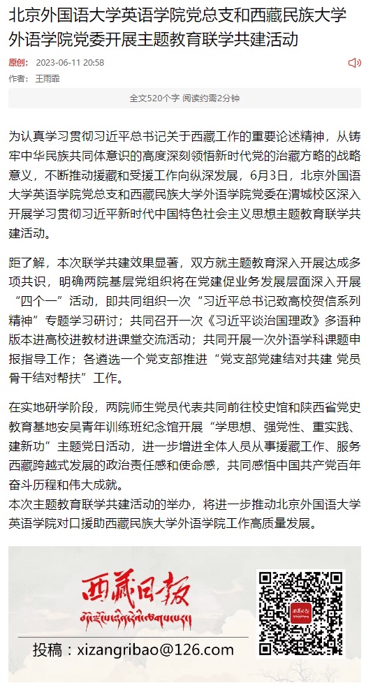 6月11日,西藏日报报道北外米兰milan官方网站党总支与西藏民族大学外语学院党委主题教育联学共建活动。