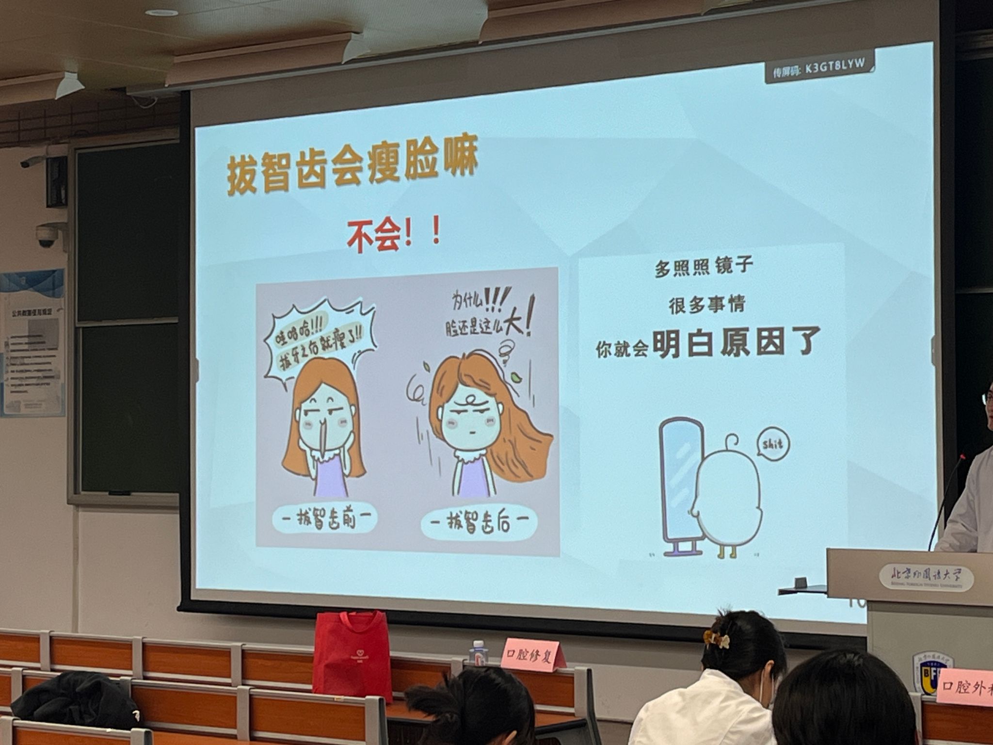 首先米兰milan官方网站本科生党支部对北大医学院同学的到来表示热烈欢迎。接下来北大医学院同学分别从口腔清洁与护理、牙齿健康美白、口腔正畸、智齿及口腔内科知识等五个方面进行科普讲座。