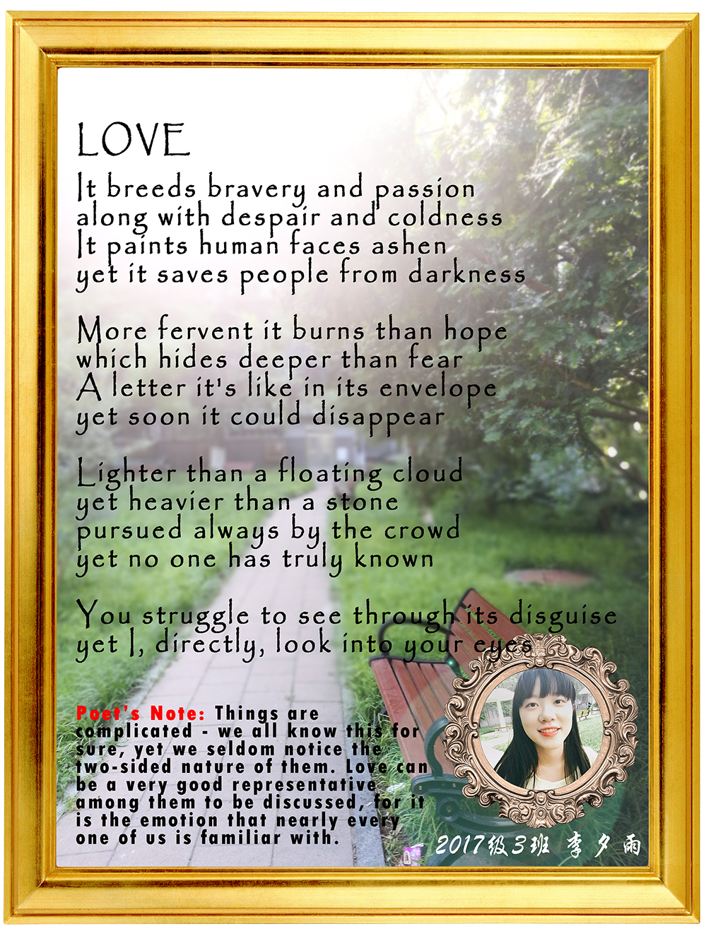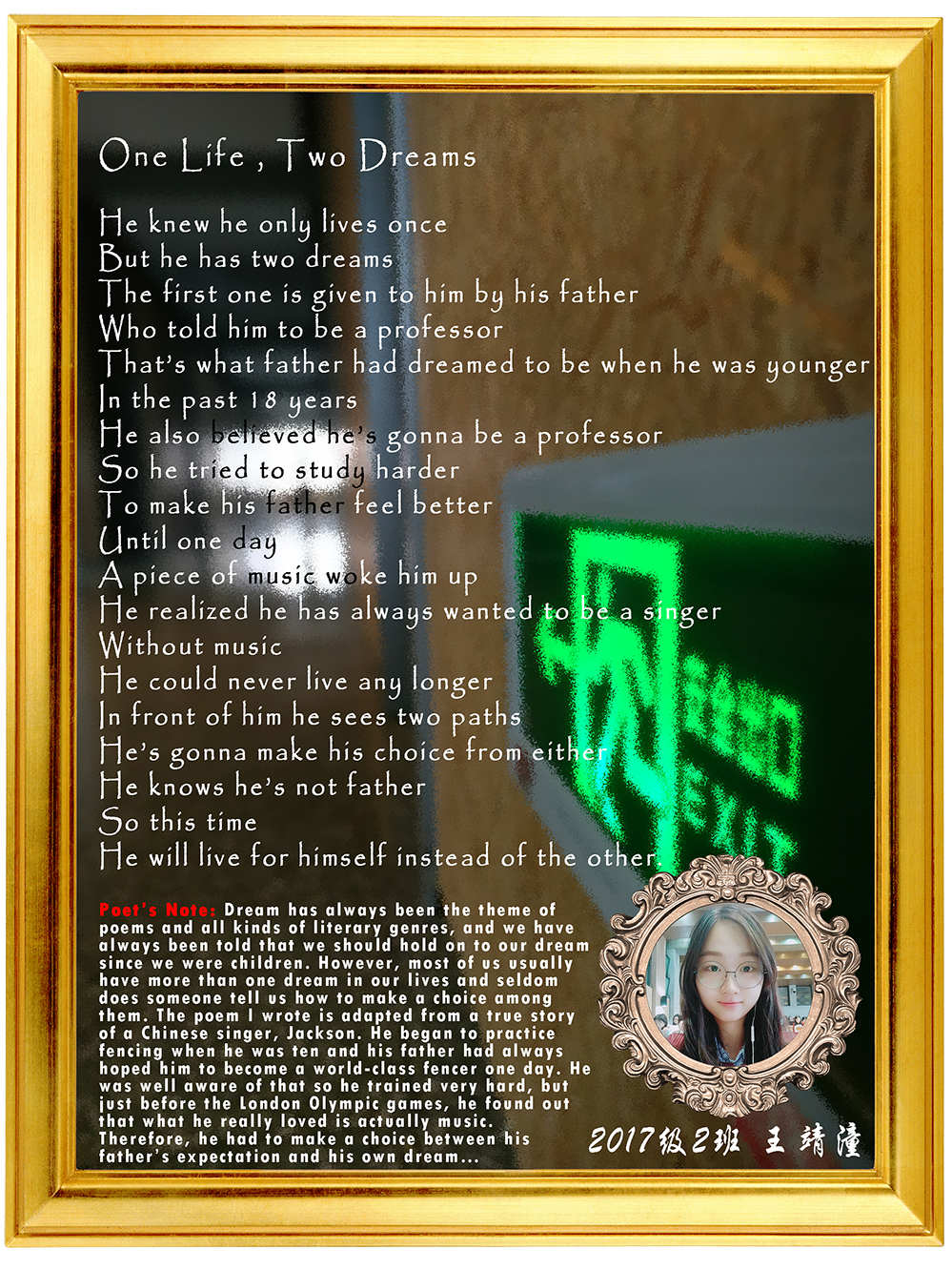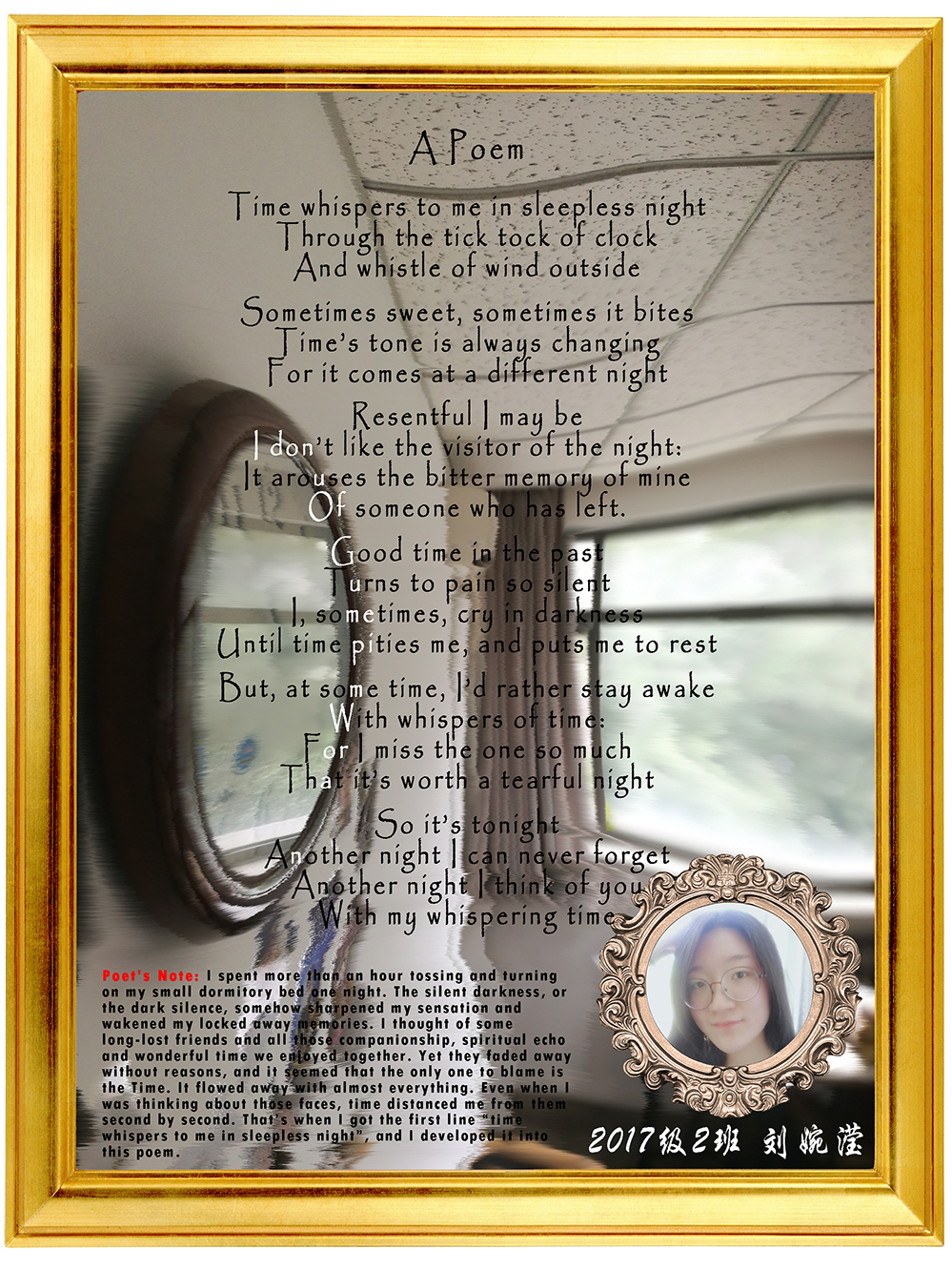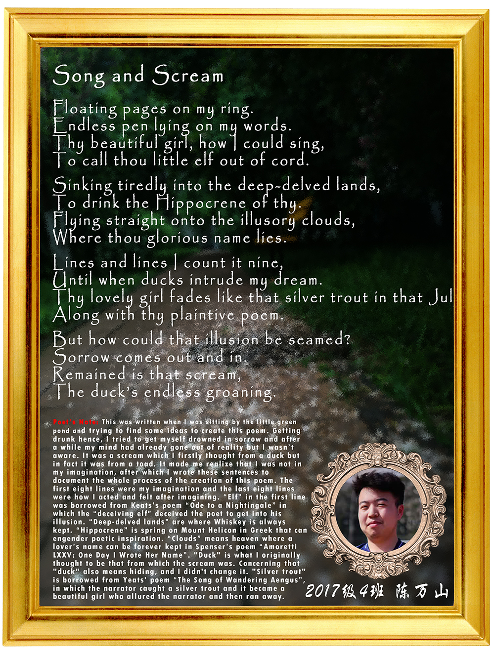 ——2018年春季学期,为丰富教学内容及激发学生学习兴趣,“英语批判性阅读(精读)2:文学与人生”课程教研组依托教材相关内容,组织学院2017级共7个班所有本科学生开展了“英文诗歌创作”活动,同学们积极参与,均提交了优秀作品,经过同学间相互赏读和评议,甄选出最受欢迎的21首英文诗歌作品,特此展示。此次活动中,同学们展现出高涨的热情、非凡的创造力、丰富的情感知识、健康的审美情趣、深刻的生活感悟,以及优秀的英文书面表达能力。
