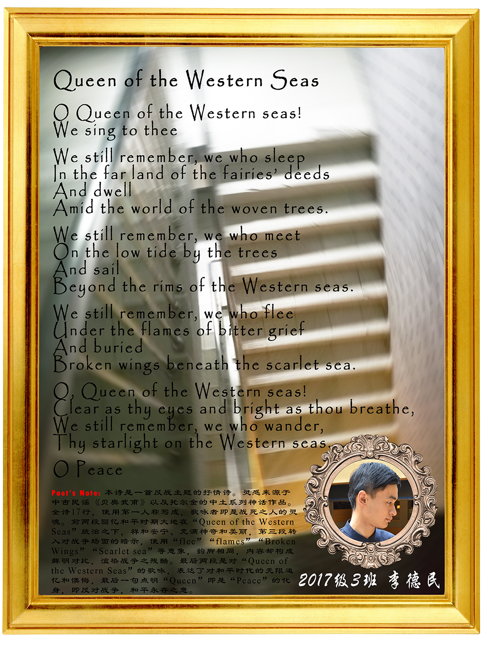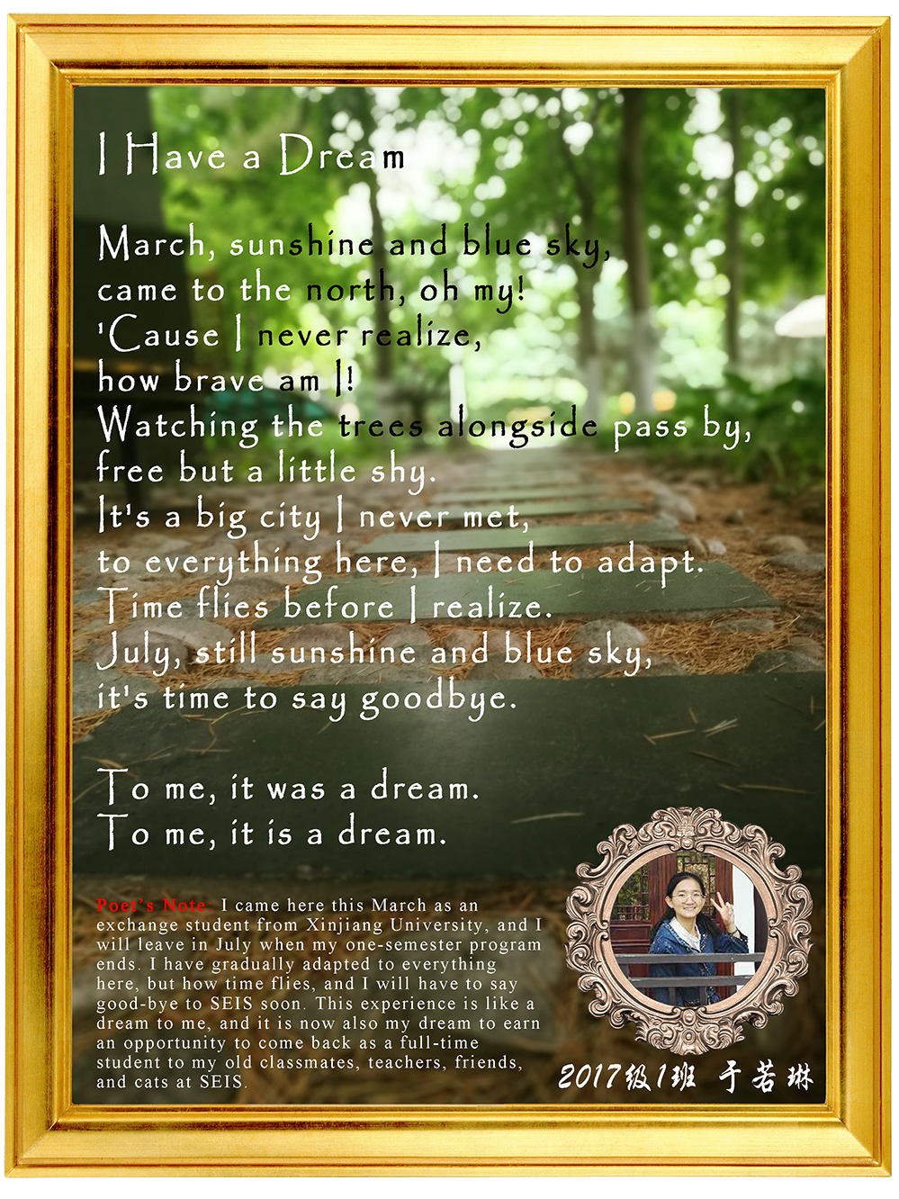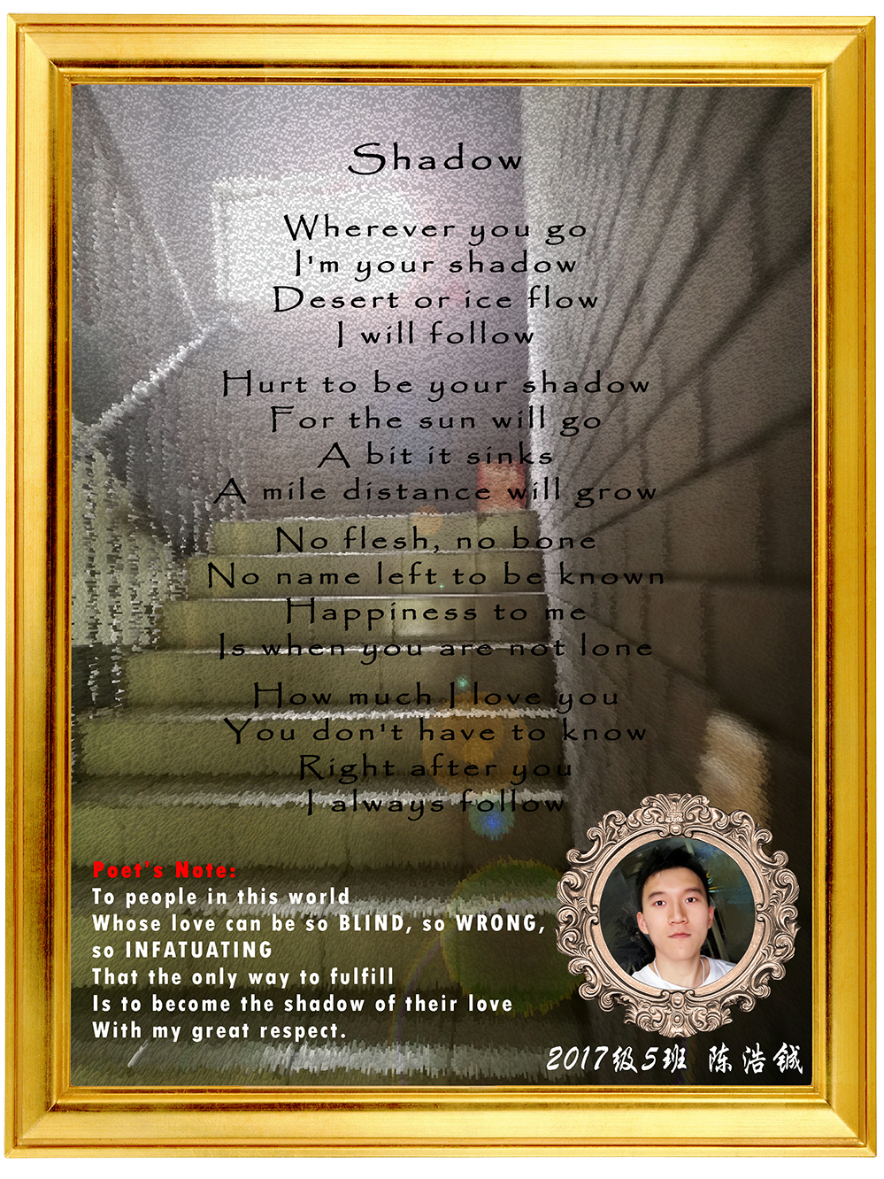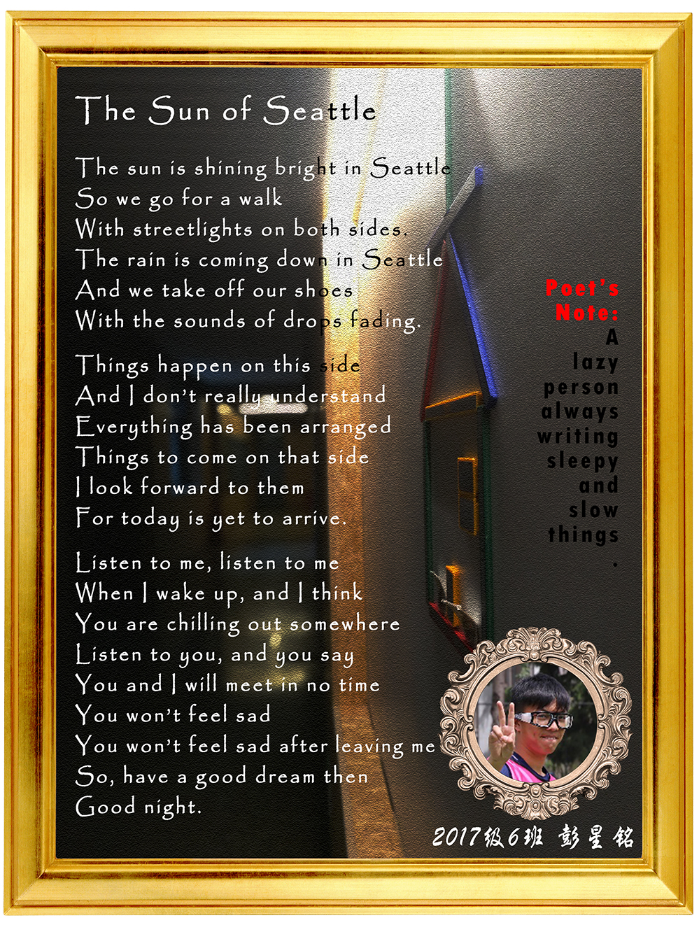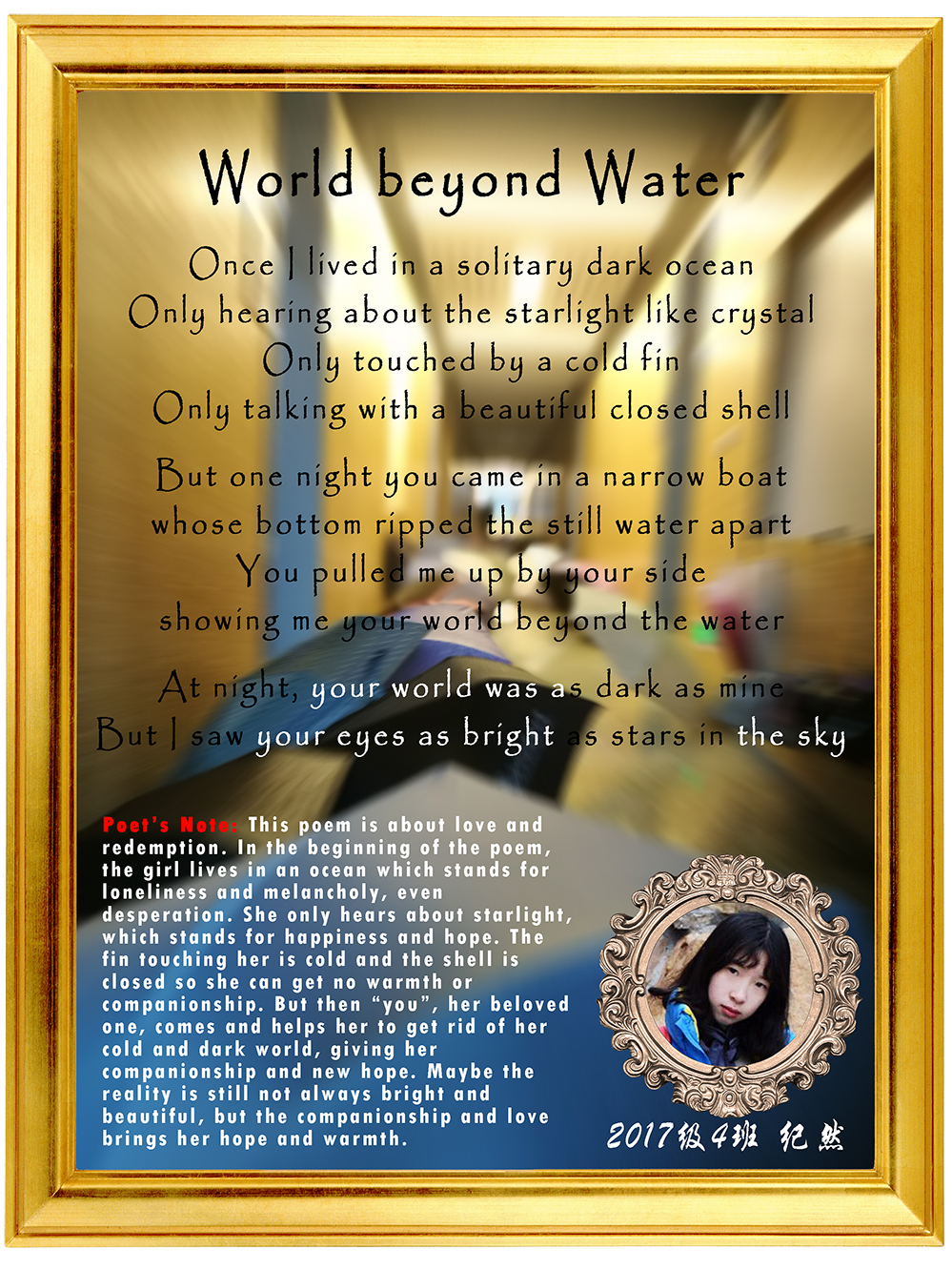 ——2018年春季学期,为丰富教学内容及激发学生学习兴趣,“英语批判性阅读(精读)2:文学与人生”课程教研组依托教材相关内容,组织学院2017级共7个班所有本科学生开展了“英文诗歌创作”活动,同学们积极参与,均提交了优秀作品,经过同学间相互赏读和评议,甄选出最受欢迎的21首英文诗歌作品,特此展示。此次活动中,同学们展现出高涨的热情、非凡的创造力、丰富的情感知识、健康的审美情趣、深刻的生活感悟,以及优秀的英文书面表达能力。