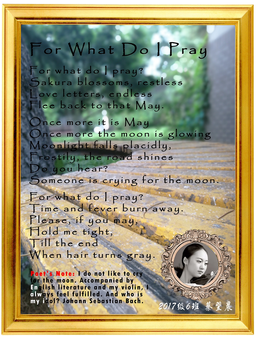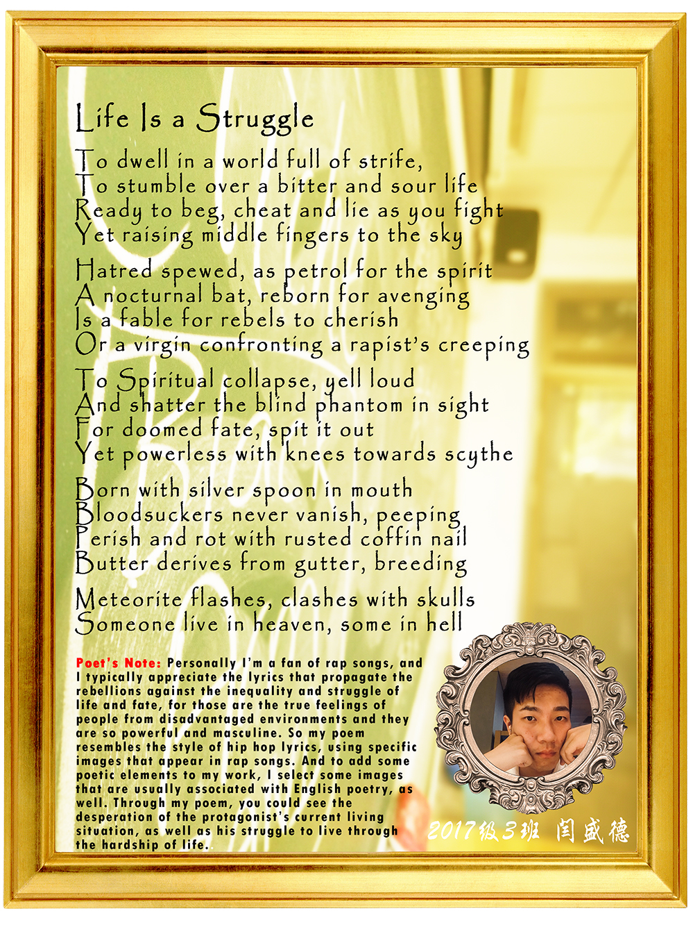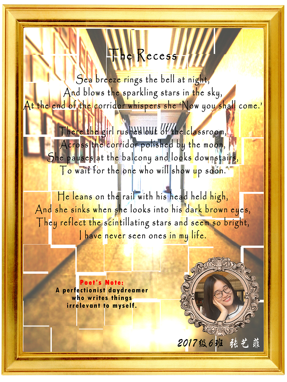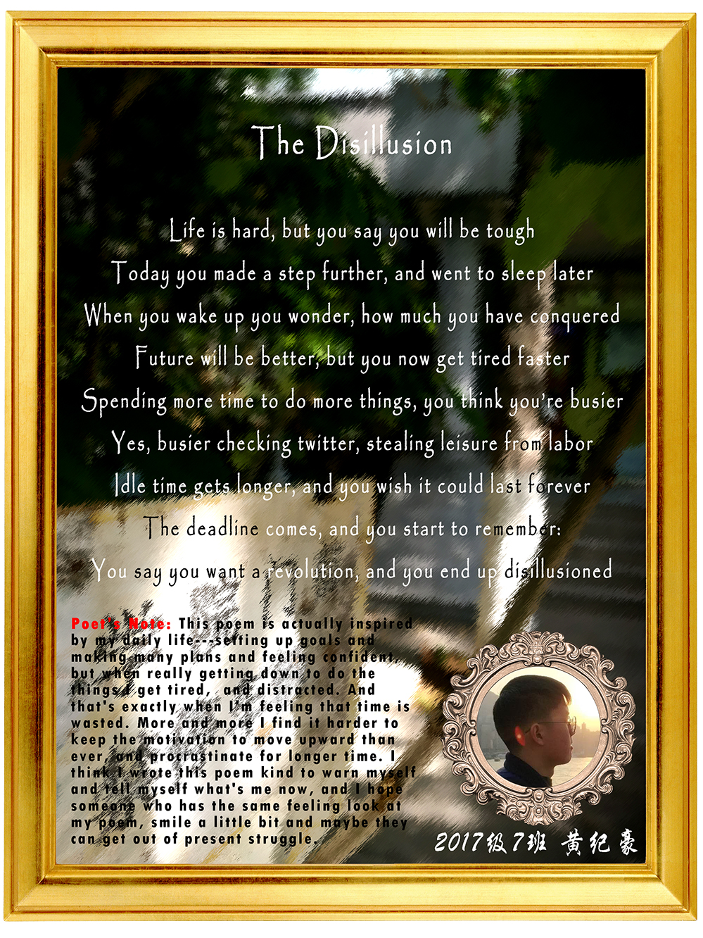 ——2018年春季学期,为丰富教学内容及激发学生学习兴趣,“英语批判性阅读(精读)2:文学与人生”课程教研组依托教材相关内容,组织学院2017级共7个班所有本科学生开展了“英文诗歌创作”活动,同学们积极参与,均提交了优秀作品,经过同学间相互赏读和评议,甄选出最受欢迎的21首英文诗歌作品,特此展示。此次活动中,同学们展现出高涨的热情、非凡的创造力、丰富的情感知识、健康的审美情趣、深刻的生活感悟,以及优秀的英文书面表达能力。