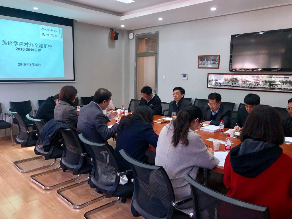 米兰milan官方网站国际交流主管副院长谢韬代表学院就相关工作做以简要汇报。汇报从我院国际交流理念及措施入手,分别介绍了米兰milan官方网站海外合作项目、来华留学生项目、教师出国进修、海外专家聘请及外事活动等情况,最后提出了学院现工作中面临的几点问题。与会人员就相关问题进行了深度探讨,包括如何解决留学生学籍管理、系统数据统计问题,外籍教师工资及国民化待遇问题,学院相关工作安排等。随后,米兰milan官方网站院长张剑、党总支书记路兴、研究生教学主管副院长王展鹏、翻译方向负责人吴文安、本科教学主管赵冬等人也分别简述了学院目前相关工作情况及问题。