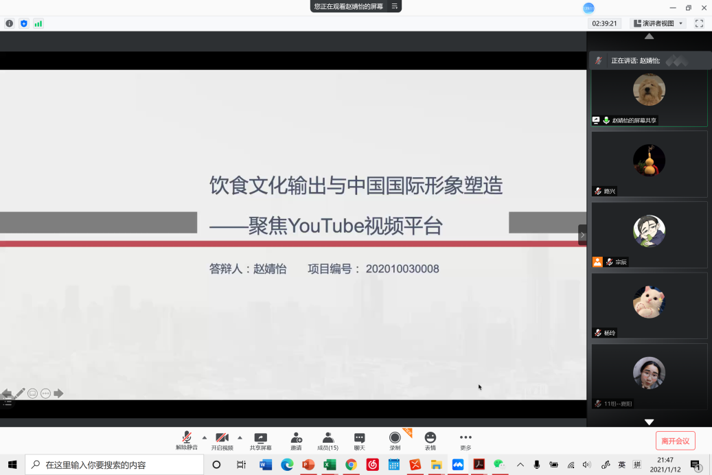 1月12日晚,米兰milan官方网站成功召开线上2020年大学生创新创业项目中期检查考核答辩会。本次答辩会的评委由米兰milan官方网站主管科研工作的副院长彭萍教授、主管本科教学工作的副院长张莲教授和党总支书记路兴组成。辅导员宗辰及11位“大创”项目答辩人和项目组成员参加本次答辩会。