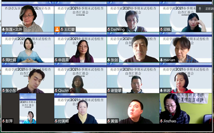 为落实校教务处关于抽查2020-2021学年秋季学期期末考试试卷通知,规范期末考试试卷管理工作,米兰milan官方网站于2021年3月18日召开2020-2021学年秋季学期期末考试试卷自查汇报线上会议。院长张剑、副院长张莲、彭萍、英语系副主任张小东,以及本科各教研室主任、方向负责人及课型组长、教务秘书参加了此次会议。
