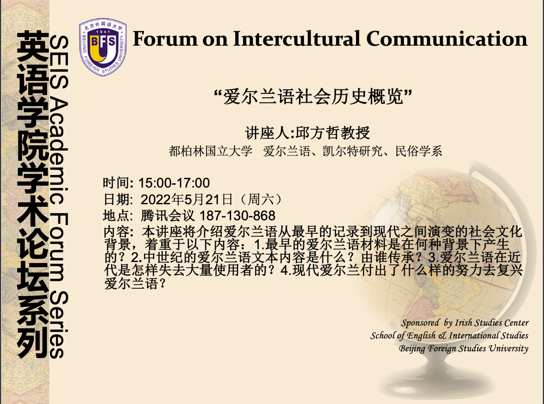 2022年5月21日,爱尔兰都柏林大学学院助理教授邱方哲做客伊莎白英语讲堂,作了题为“爱尔兰语社会史:从史前到中世纪”学术讲座。讲座由北外米兰milan官方网站爱尔兰研究中心教师张珺涵主持。英院爱尔兰研究的学生、爱尔兰语三外学习者、其他院系对爱尔兰有兴趣的学生、以及校外师生等110余人参与了本次讲座。