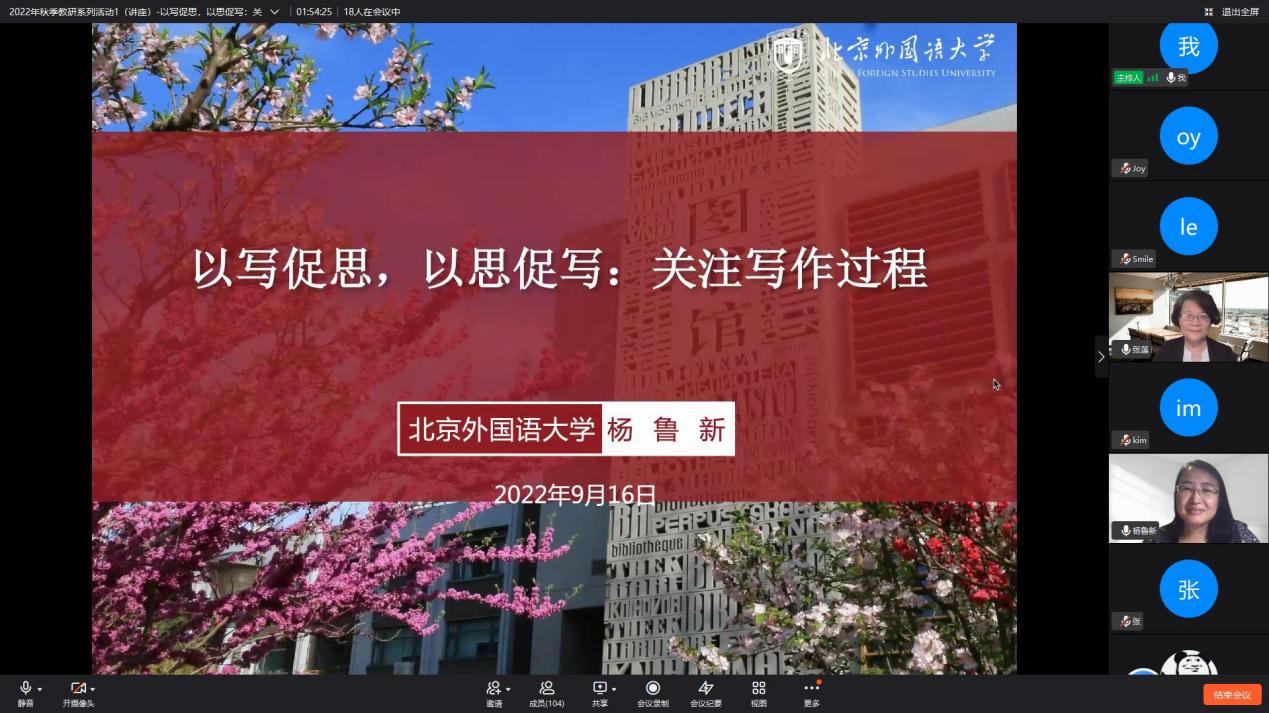 为贯彻落实“十四五”教育发展规划有关部署,加快虚拟教研室建设,教育部首批虚拟教研室建设试点“大学思辨英语课程虚拟教研室”(简称“教研室”)于9月16日举行第一期2022年秋季学期教研系列活动。米兰milan官方网站副院长杨鲁新教授做了题为“以写促思,以思促写:关注写作过程”的讲座。讲座由虚拟教研室负责人张莲教授主持。