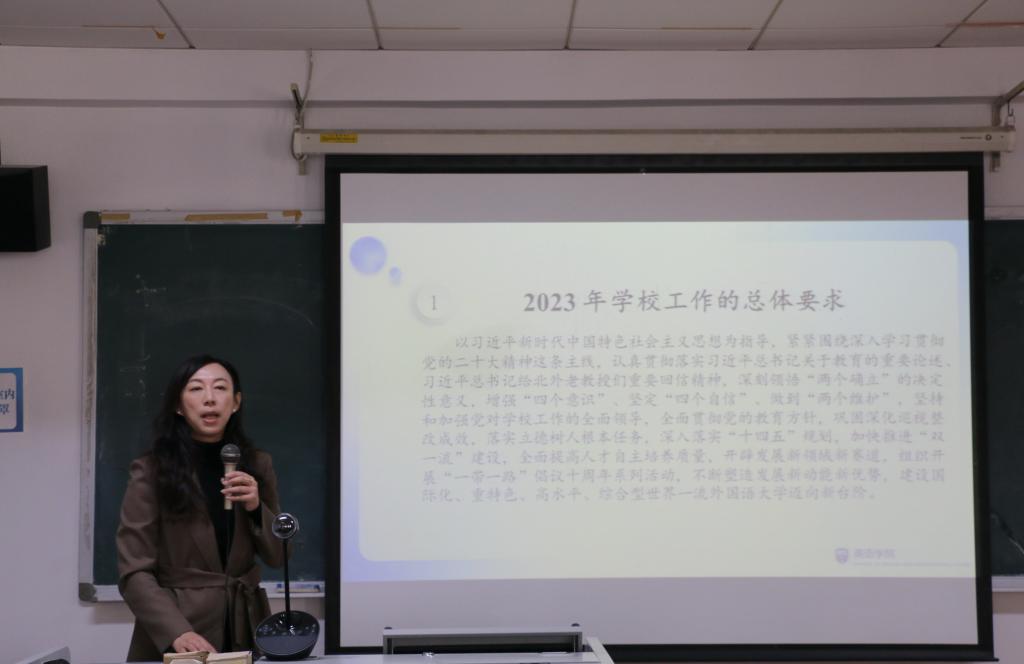 党总支书记王明欣就学院党建和思政工作进行了全面部署。她通报了2023年学校工作的总体要求,结合米兰milan官方网站实际,从五个方面提出学院党建工作的重点和目标。一是要突出政治建设,不断强化思想引领。把学习贯彻党的二十大精神与学习贯彻习近平总书记给北外老教授重要回信精神结合起来,推进党的二十大精神进课堂进头脑,培养更多“三有”人才。二是要突出制度建设,严格落实主体责任。持续推动学院科学决策,全面筑牢意识形态“防火墙”。三是要强化党组织自身建设,继续推进教师党员队伍建设,对标对标创先争优。四是要落实立德树人根本要求,构建协同育人格局及五大育人体系。五是要推进学院文化建设,培育暖心聚爱的学院文化。