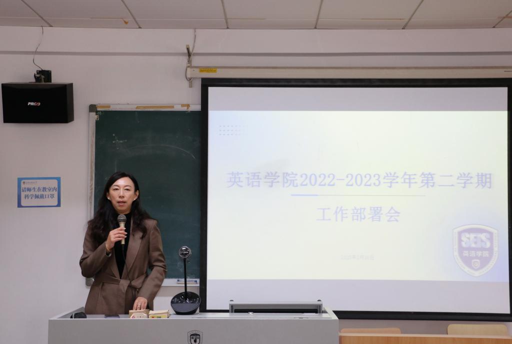 副院长张莲介绍了本科生课程开设及师资建设情况,并指出要在确保教学、管理、辅导、考试等日常工作顺利开展的基础上,着重做好国家一流本科专业建设、虚拟教研室建设、北外-人大21世纪马克思主义国际传播项目班建设、教学立项、常态化辅导以及教务管理等工作。副院长王展鹏从研究生招生宣传、导师制建设、课程思政、论文答辩以及育人模式等方面,提出要“扎根中国大地、对标世界一流”,全面提高研究生人才培养质量。副院长彭萍就新学期科研工作和对外合作工作进行了介绍。她鼓励教师积极申报国社科、教育部等各级各类科研项目。提出要规范各类讲座、研讨会、学术沙龙的申报、审批、管理和检查工作。在对外合作中,要做好师生出国出境交流学习的安全保障工作,不断推进2023年高端引智以及与国外大学合作项目。党总支副书记孟庆琨汇报了本学期学生工作的重点。一是结合“两会”“五四”等重要时间节点,加强大学生思政教育。二是全力做好2023届毕业生就业保障工作。三是积极开展心理问题及困难学生帮扶工作。四是依托英语文化节,不断丰富创新校园文化活动。