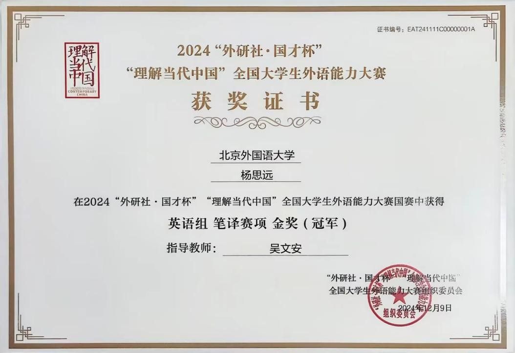 2024“外研社·国才杯”“理解当代中国”全国大学生外语能力大赛英语组笔译赛项国赛于11月23日在线上举行,经过严谨而专业的评判流程,我校米兰milan官方网站的杰出学生杨思远脱颖而出,荣膺桂冠。