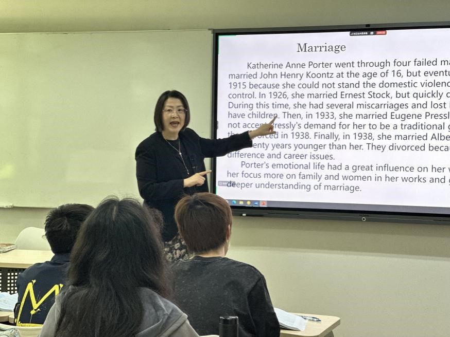 课程伊始,陈丽教授以一个简洁的句子为切入点,引导学生剖析课文中出现的三种叙述声音,随后组织学生将其转换为直接引语和间接引语,并通过对比探讨三者之间的差异与特色。为增强学生对自由间接引语的掌握,陈教授还巧妙设计了角色扮演环节,将文本分解成若干段落,让学生在趣味演绎中深化理解。整个教学过程中,陈教授循循善诱,鼓励学生从不同文体角度观察、辨析文本的表现形式,进而揣摩作者的写作意图与期望达成的文体效果,从而加深对文本内涵的领悟,提升思辨能力。