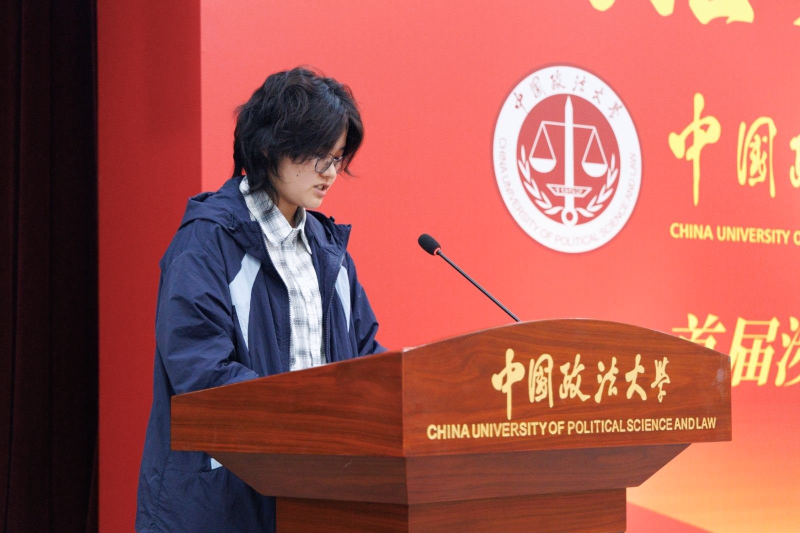 北京外国语大学毕业生代表蒋荣在发言中分享了联培班丰富多彩的校园生活。她特别提到:“兼容并蓄,博学笃行”、“厚德明法,格物致公”,两校的校训,最后成为了“语通中外,法治天下”的班训,如车之两轮,鸟之双翼,相辅相成,相伴而生。面对未来,她引用习近平总书记对涉外法治人才培养的重要指示,号召同学们将个人发展与国家命运紧密相连,以扎实的专业能力、开阔的国际视野和强烈的家国情怀,为构建人类命运共同体贡献青春力量,为世界文明的交流与融合增添一抹亮色。
