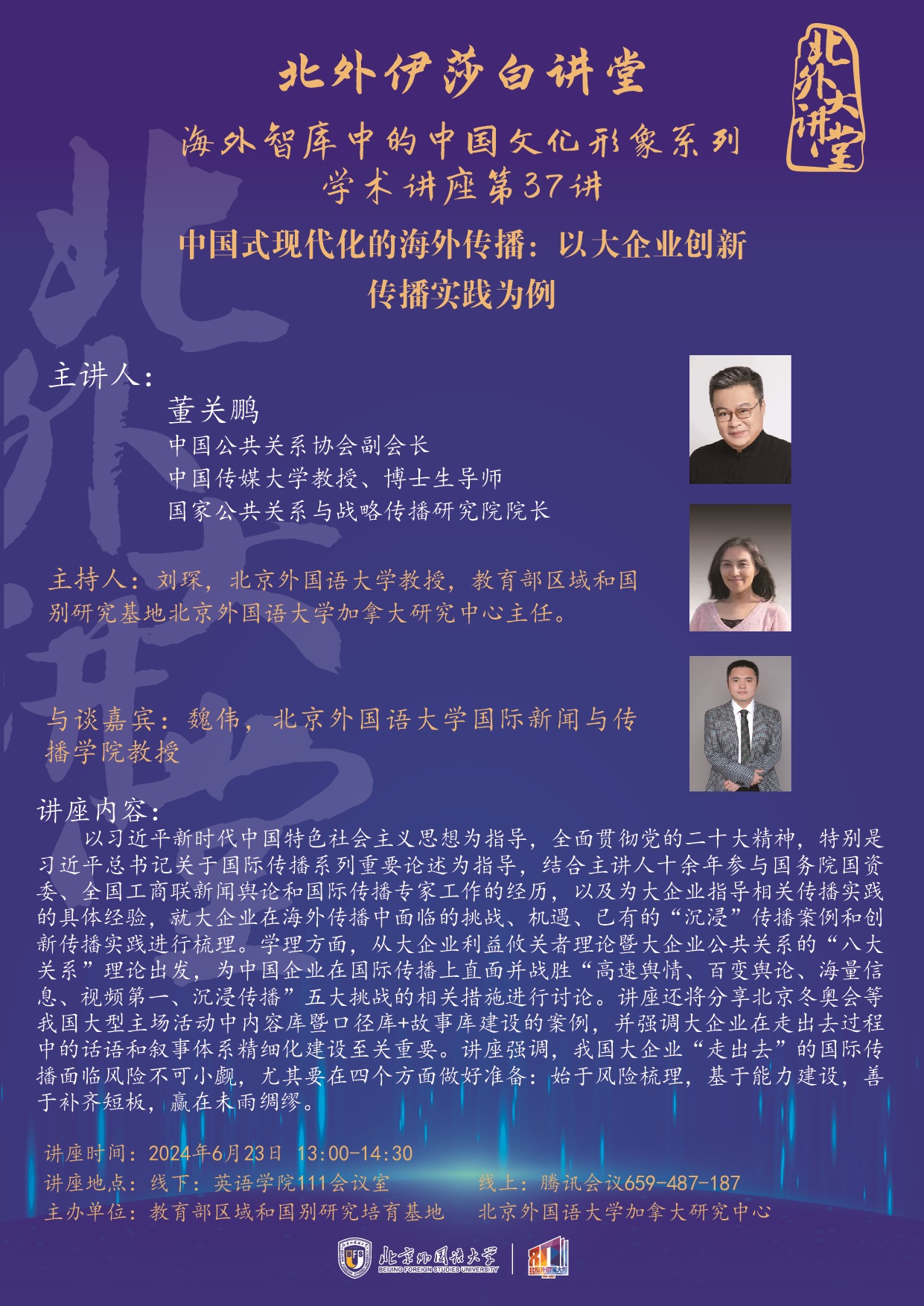 以习近平新时代中国特色社会主义思想为指导,全面贯彻党的二十大精神,特别是习近平总书记关于国际传播系列重要论述为指导,结合主讲人十余年参与国务院国资委、全国工商联新闻舆论和国际传播专家工作的经历,以及为大企业指导相关传播实践的具体经验,就大企业在海外传播中面临的挑战、机遇、已有的“沉浸”传播案例和创新传播实践进行梳理。学理方面,从大企业利益攸关者理论暨大企业公共关系的“八大关系”理论出发,为中国企业在国际传播上直面并战胜“高速舆情、百变舆论、海量信息、视频第一、沉浸传播”五大挑战的相关措施进行讨论。讲座还将分享北京冬奥会等我国大型主场活动中内容库暨口径库+故事库建设的案例,并强调大企业在走出去过程中的话语和叙事体系精细化建设至关重要。讲座强调,我国大企业“走出去”的国际传播面临风险不可小觑,尤其要在四个方面做好准备:始于风险梳理,基于能力建设,善于补齐短板,赢在未雨绸缪。