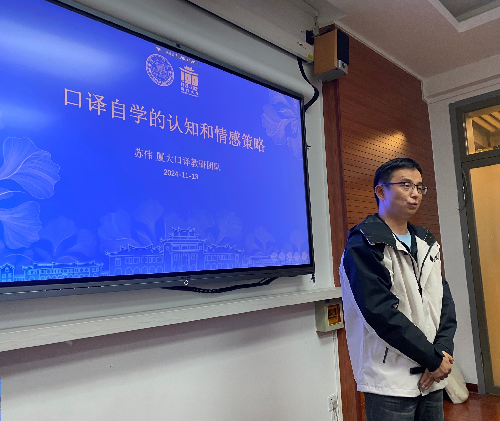 2024年11月13日下午2点,厦门大学外文学院英语系主任苏伟教授应米兰milan官方网站MTI口译中心邀请,在米兰milan官方网站楼115会议室为我院师生带来了一场题为《口译自主学习的认知与情感策略研究》的精彩讲座。讲座由高彬教授主持,共40余师生参与。