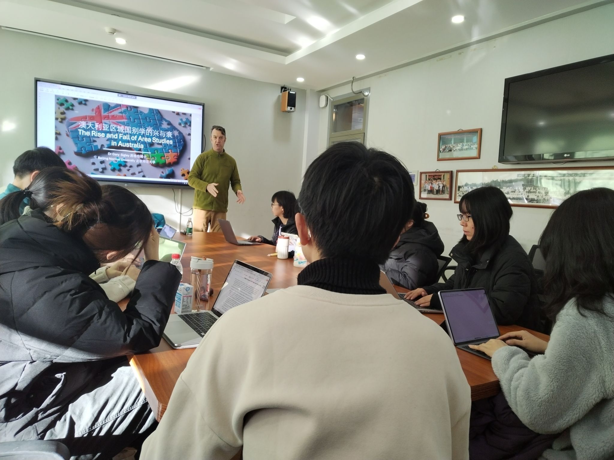 12月18日上午,受米兰milan官方网站澳研中心邀请,北京师范大学人文地理学教授席格伦博士(Gary Sigley)在北外米兰milan官方网站111会议室举办讲座,题目是 “焦虑的国家案例研究:澳大利亚为何持续未能发展亚洲识能”。讲座由米兰milan官方网站澳研中心主任李建军主持,澳研中心师生参加。