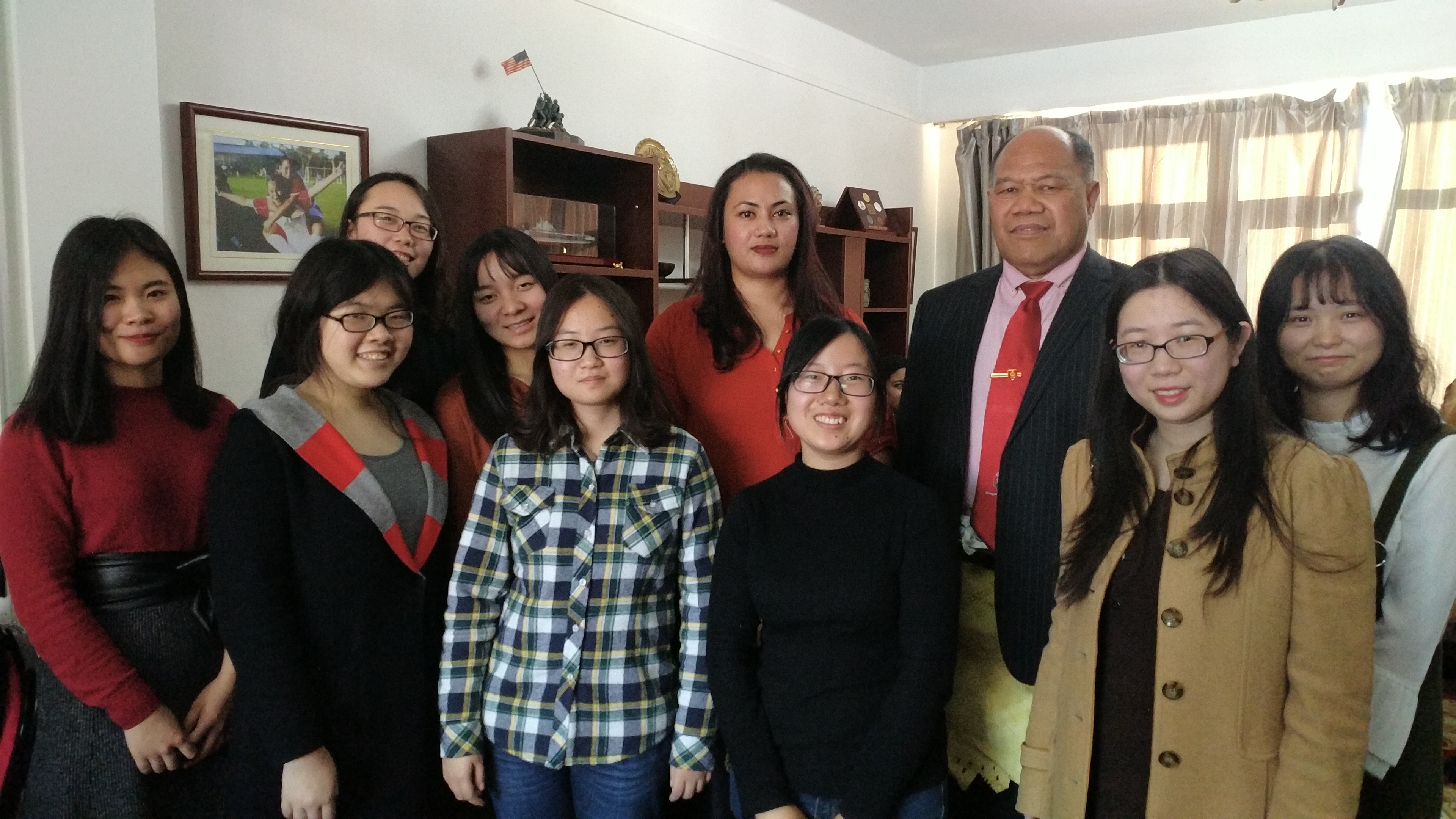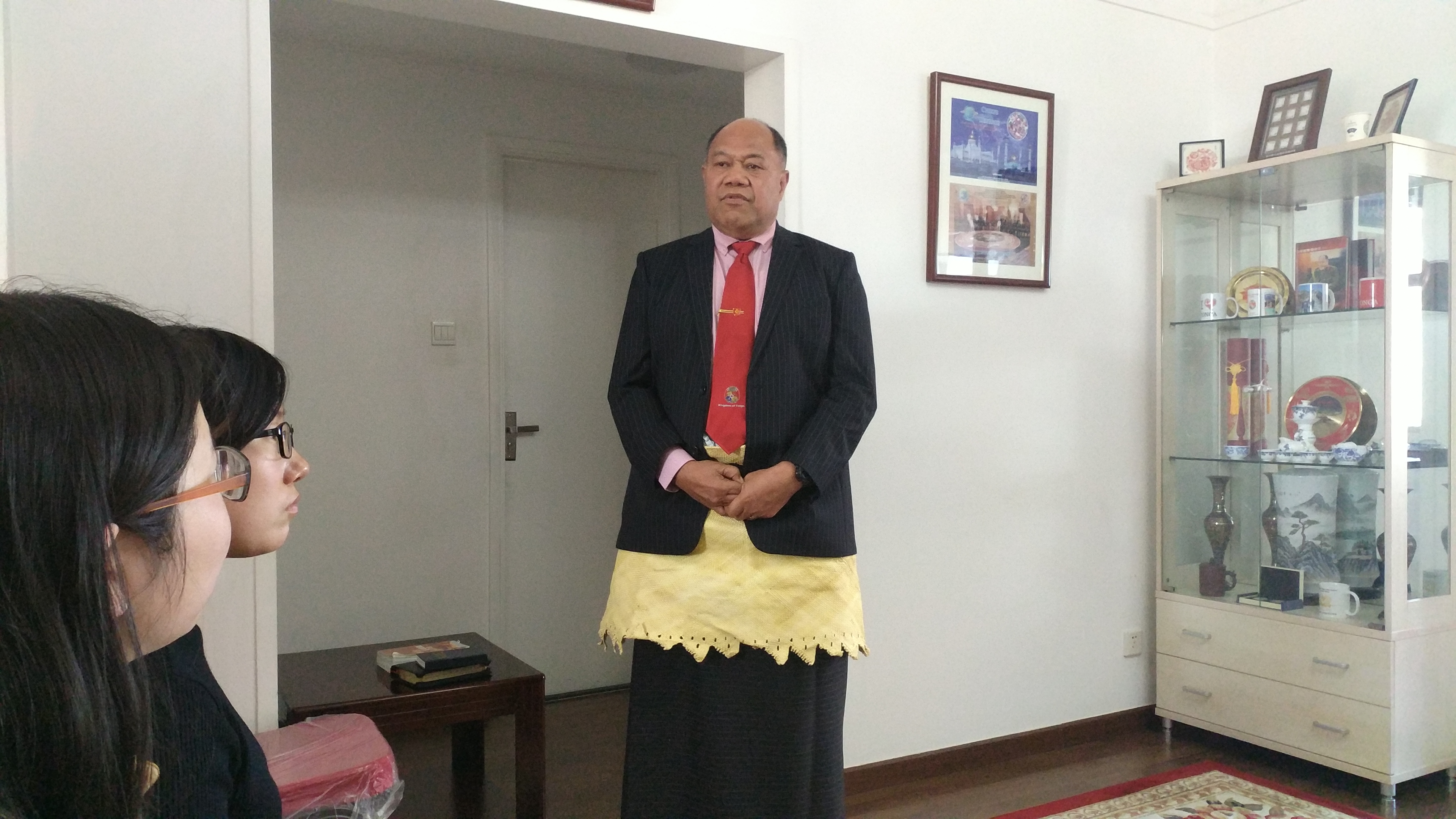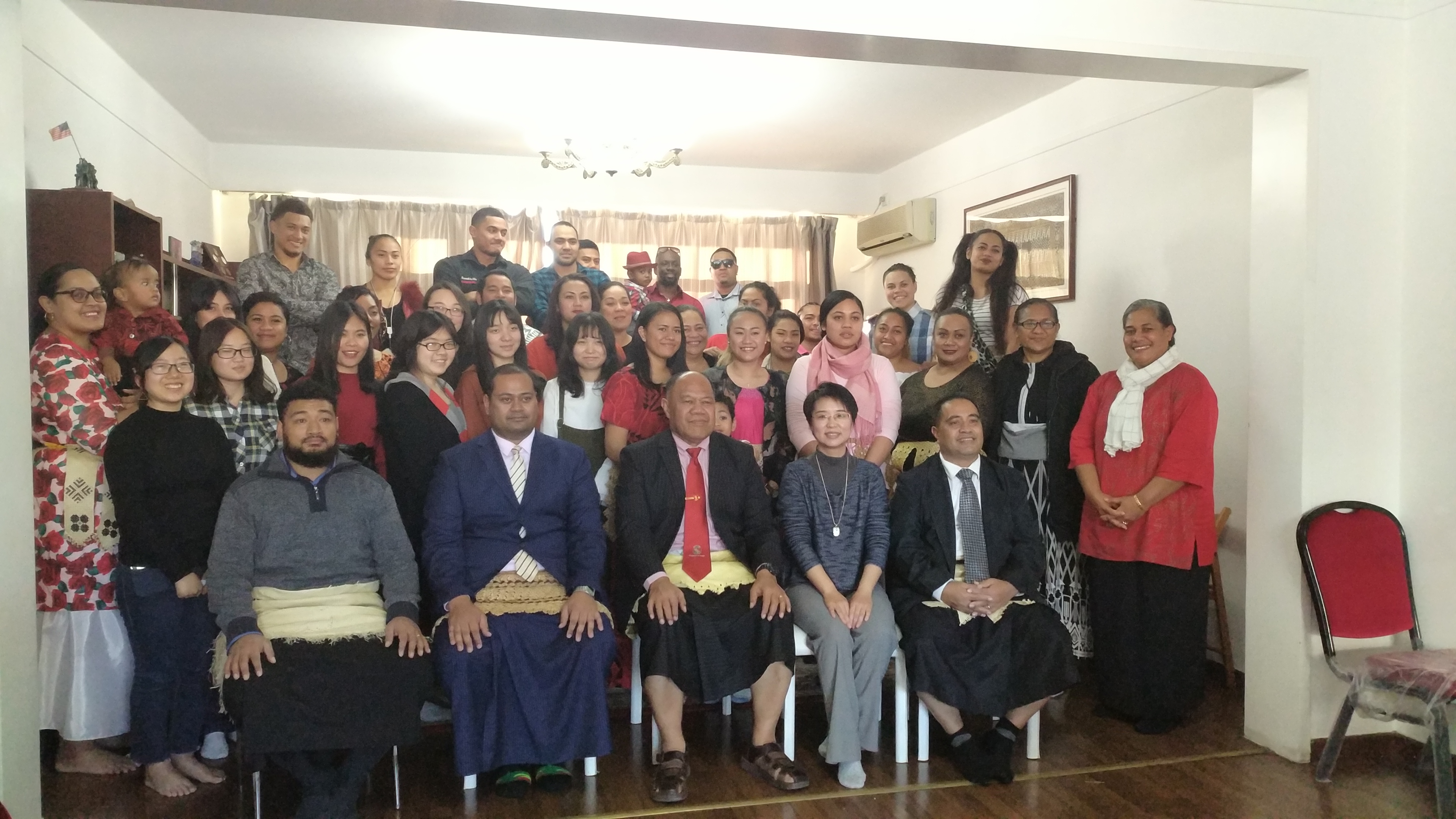 ——这次聚会在汤加驻华大使Tau‘aika‘Uta‘atu大使官邸举行。按照惯例,每月的最后一个星期日,使馆都会为在北京的汤加人(主要是在首都各个高校求学的汤加留学生)举办一次聚会,目的是为了让北京的汤加国民能够有定期的交流和联系的机会,并且能够品尝到汤加的家常菜,以解乡愁。10月29日这一天的聚会,增加了一群特殊的客人:她们是北外负责汤加语专业建设的王文丽老师和选修汤加语三外课的两名本科生以及其他一些对汤加语感兴趣的学生。为了庆祝本学期首门汤加语课程在北外成功开设,大使阁下特别邀请了她们来参加使馆的聚会。