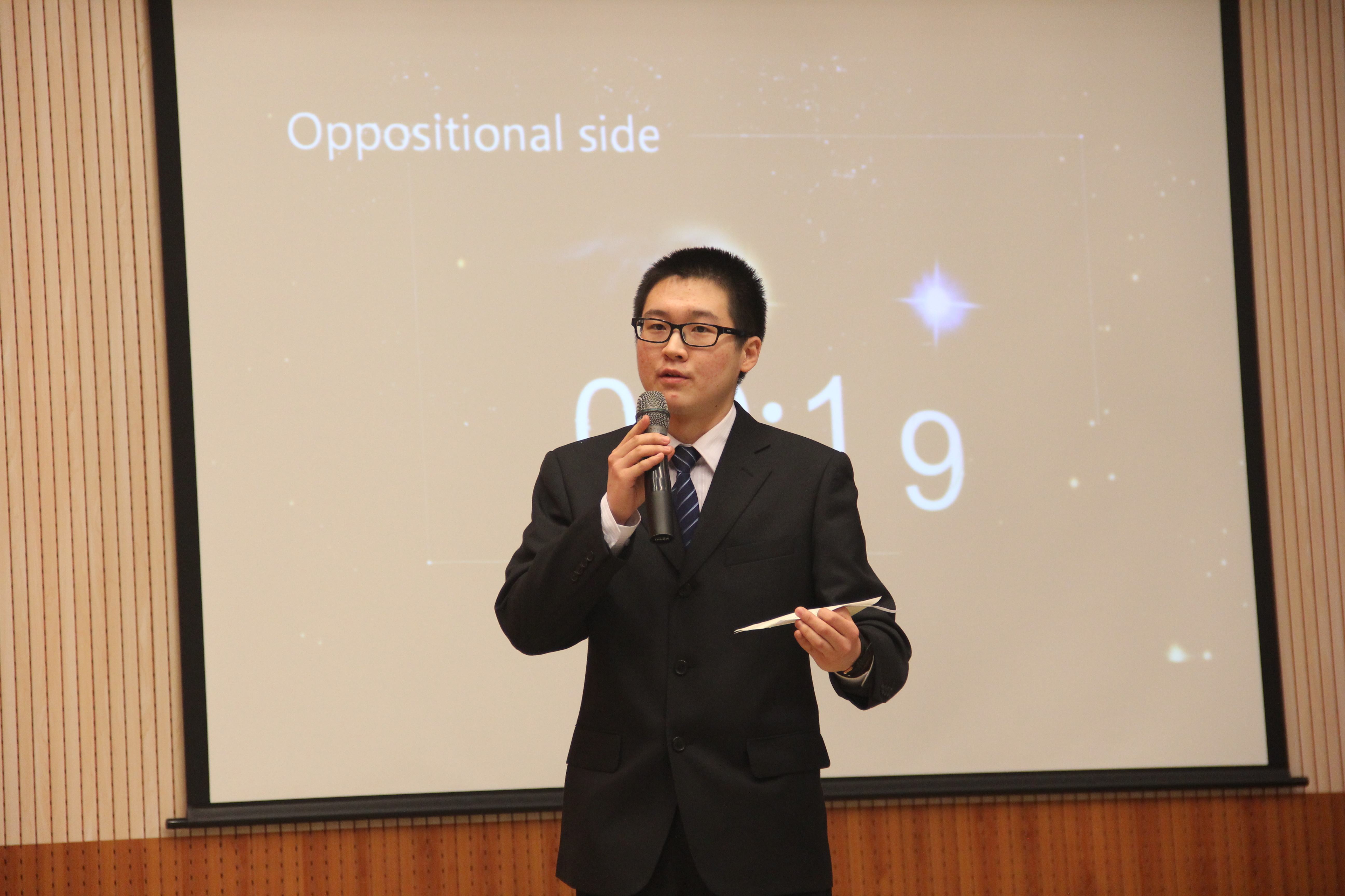 ——第一环节结束后,5号选手张子韬的得分暂居榜首。随着大家抽签组成正反方,第二环节的辩论正式开始。参赛选手用实力演绎了一场强强对阵,精彩绝伦的比赛。而本轮中,张子韬选手和来自北外辩论队的赵晴同学就“大学是否应该禁止师生恋”这一问题展开了精彩的辩论,双方的论据都十分强有力,辩论的紧张也感染了现场的每一位观众。