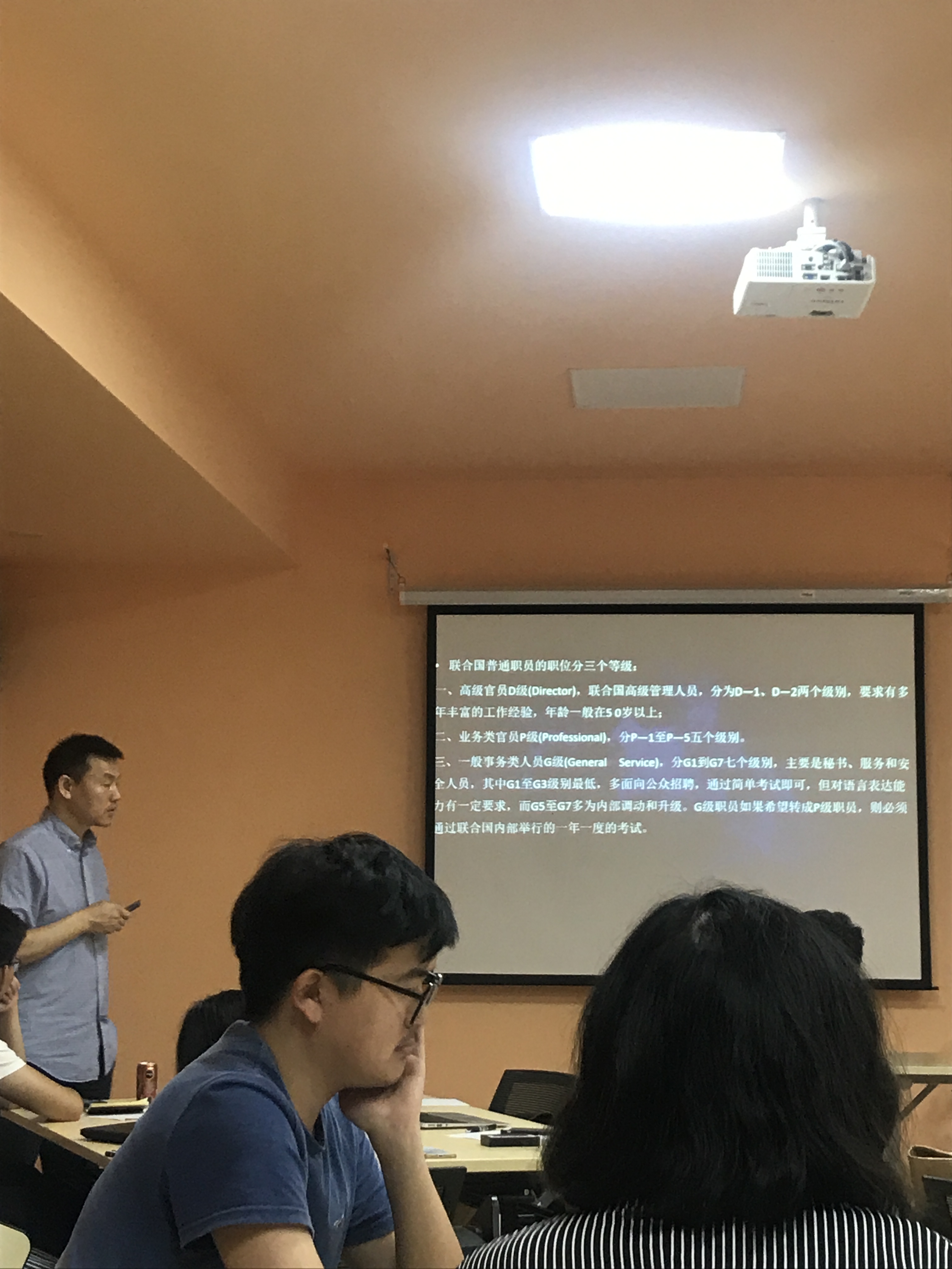 ——在课堂上,张教授首先将国际组织同主权国家进行了比较,指出国际组织具有无领土居民、非主权性、非强制性的特点。通过列举联合国决议、播放教学视频、与同学们讨论当下时政热点等方式,他向同学们解释了政府间与非政府国际组织、全球性与地区间国际组织、国际公务员等概念。接下来,从联合国、欧盟、亚投行、博鳌论坛等案例出发,同学们一起深入分析了国际组织的运作方式,以及其在当今国际事务中扮演的重要作用。课程随后着眼于中国同国际组织的关系变迁,张教授指出,如今在国际组织,中国虽然已经有了一定的影响力和话语权,但还是存在着中国籍国际公务员人数少、人才培养机制有待完善等不足之处。最后,本期课程的助教、来自高级翻译学院2016级MTI的徐雪惠结合自己在联合国新闻处的实习经历,为同学们简要介绍了联合国实习机会的申请方式和竞聘流程,强调了突出的个人素质和扎实的业务功底在实习申请中的重要性。通过本次课,同学们掌握了国际组织的基本情况,明确了中国在国际组织的地位和作用。