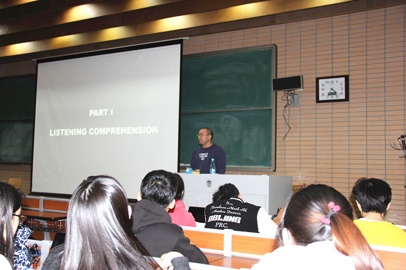 随后,刘波老师以幽默风趣的方式为在场的同学进行了一次考前压力疏导和考场发挥技巧指导。刘波老师鼓励同学们要对自己有信心,无论是在考前准备的最后一周中还是在考试场上,大家都要平心静气,按部就班,不要让焦虑与压力冲昏头脑,影响发挥。此外,老师还提醒同学们在考试中利用好时间;在听力考试中不要胡思乱想,以免打乱答题节奏;做阅读理解时,可视情况调整篇章顺序,由简入难;面对容易失分的语言知识题,同学们可以巧妙利用规律,寻找答案。针对写作,刘波老师也为同学们准备一段顺口溜,帮助同学掌握作文结构和写作重点。