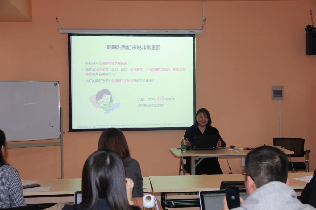 讲座一开始,王宁首先向老师们询问睡眠情况相关问题,借此引入睡眠质量对于人们的情绪调整的影响,阐明针对抑郁症患者的疏导应遵循“倾听,观察,交流”三步走的思路,并现场与老师们进行了互动实践。