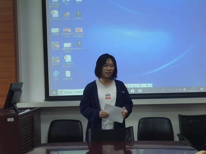 周羽西同学结合自身经历,讲述了自己对于新时期爱国主义的独特理解;高玉洁同学通过结合自己的切实经历,表达了自己对祖国深深的热爱;周逸仙同学以扶贫为主题,展示了中国如何将一个个孤岛连成大陆;王新园同学以“我们应该记得什么”的问题开头,表达了铭记历史、铭记英雄的主题;李汶蓉同学结合自己做志愿者的经历,告诉了我们“奋斗的青春最美丽”;翟姊祺同学结合翻译专业的发展史,提出了对自己的期望,希望自己今后能够在翻译事业中贡献出自己的力量。