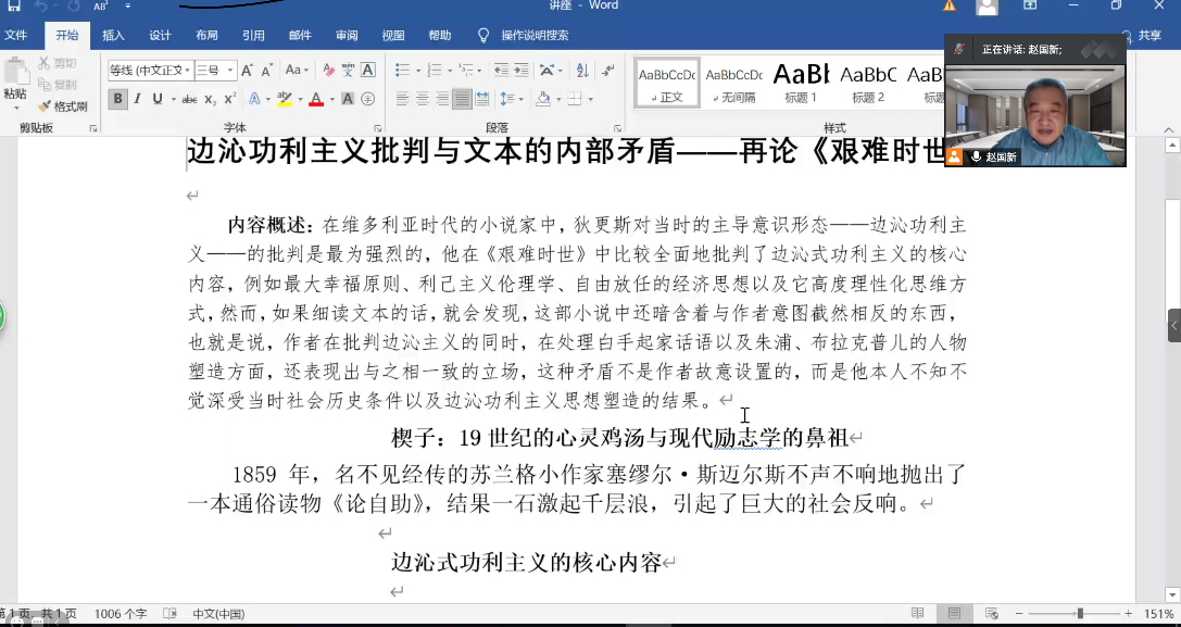 2021年2月2日晚,米兰milan官方网站“边沁功利主义批判与文本的内部矛盾——再论《艰难时世》”专题讲座如期举办。本次讲座邀请到米兰milan官方网站赵国新教授为同学们分析文学作品中所体现的边沁功利主义及其内部矛盾,帮助同学们理解丰富的文学知识、提升文学素养。