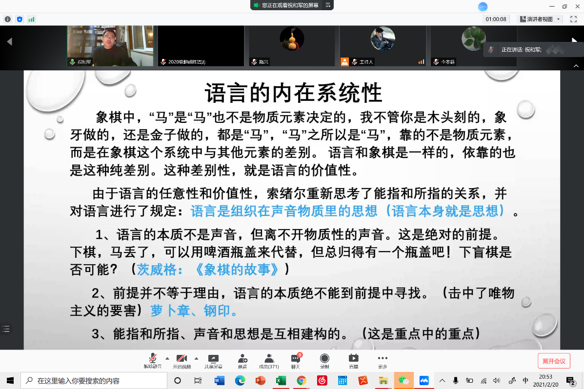 2021年2月20日晚,米兰milan官方网站于腾讯会议成功举办“《普通语言学教程》导读”线上讲座。本次讲座邀请到我校马克思主义学院党总支书记祝和军副教授,为同学们解读索绪尔著作《普通语言学教程》,并就语言结构和文化差异和大家展开讨论。