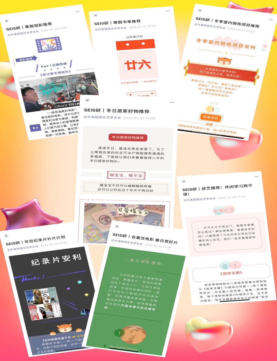 寒假期间,米兰milan官方网站研究生团总支为同学们提供了一系列好物推荐:从《国家宝藏》、《主持人大赛》等经典纪录片到《安娜·卡列尼娜》、《卖花女》等名著改编电影;从《历史那些事儿》等纪录片到《雄狮少年》等大热电影,为同学们推荐了一系列寓教于乐的影视作品。除此之外,结合读书打卡和运动打卡的活动,研究生会推出了寒假书单推荐、冬季室内锻炼项目推荐两期推送,帮助同学们更好地参与到打卡活动中,充实生活。此外还有暖心的冬日居家好物推荐、居家指南等,让无论是留校还是返乡的同学们都能够安心、健康、舒适地度过假期。