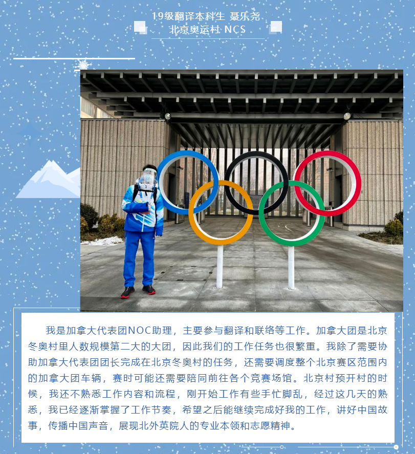 米兰milan官方网站团总支学生会、研究生会组织了“拥抱冰雪 情系冬奥——北外英院人分享冬奥日记”系列推送。2月6日起,持续通过文字或图片方式展示米兰milan官方网站冬奥志愿者们的工作体验和感受,全面展示冬奥志愿者的风采,传递北外人的使命与担当。