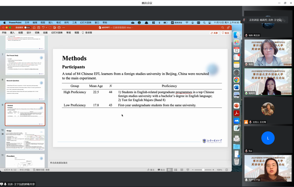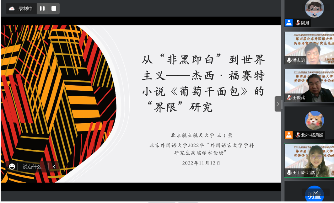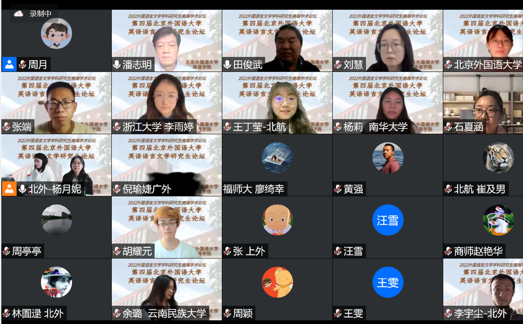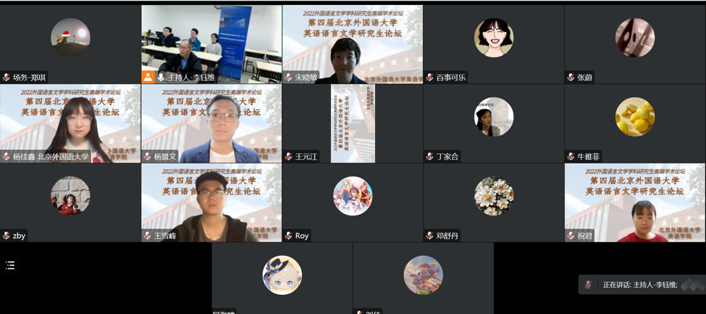 2022年11月11日至12日,第四届北京外国语大学英语语言文学研究生论坛(2022)以线上、线下相结合的方式举行。论坛是面向全国高校和研究机构相关专业研究生举办的学术交流活动,共收到来自全国50多所高校外语学科的硕士生及博士生投稿近350篇。