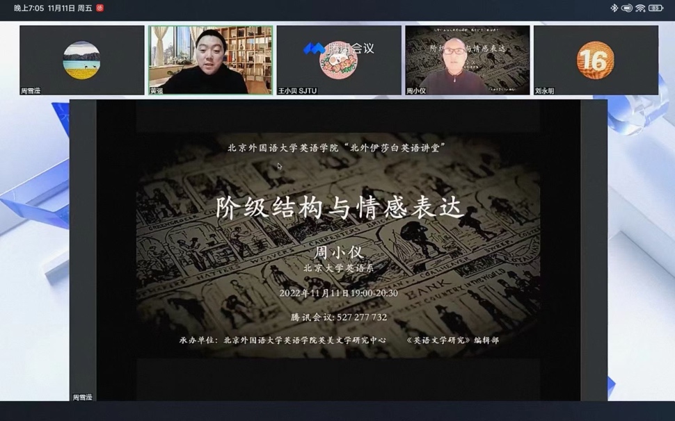 北京大学周小仪教授分享了他关于阶级结构与情感表达的看法,从阶级关系的角度解释典型性形象、中产阶级美学和东方妖魔化等文学、文化现象的深层原因。帮助同学们理解阶级关系对文化阐释的作用,认识我们在世界经济和文化格局中的位置。