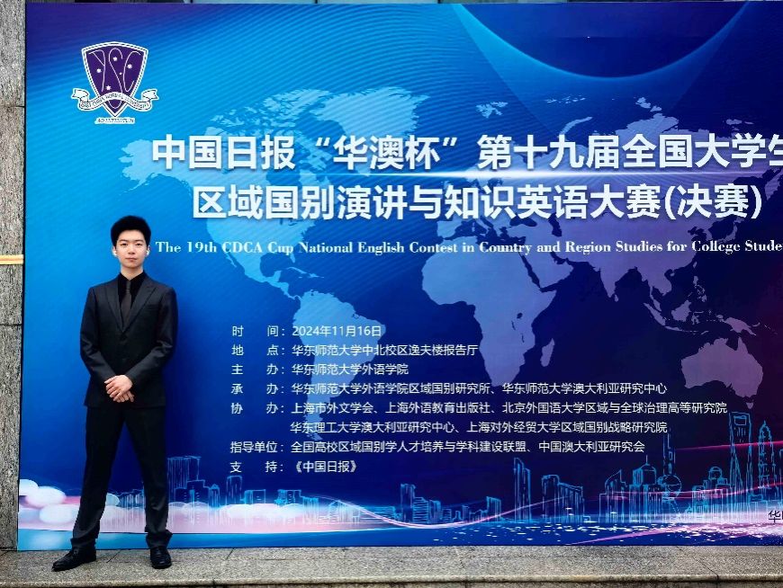 2024年11月16日,由华东师范大学外语学院主办,华东师范大学外语学院区域国别研究所、华东师范大学澳大利亚研究中心承办,上海市外文学会、上海外语教育出版社等单位协办的《中国日报》“华澳杯”第十九届全国大学生区域国别演讲与知识大赛圆满落幕。经过激烈的比赛竞争,米兰milan官方网站2023级翻译(外交外事高级翻译)专业本科生黄启恒最终夺得亚军,荣获特等奖。黄启恒指导教师为周杜娟老师。