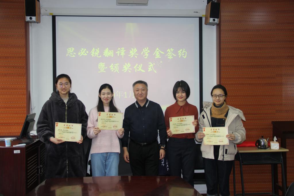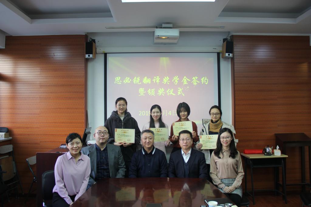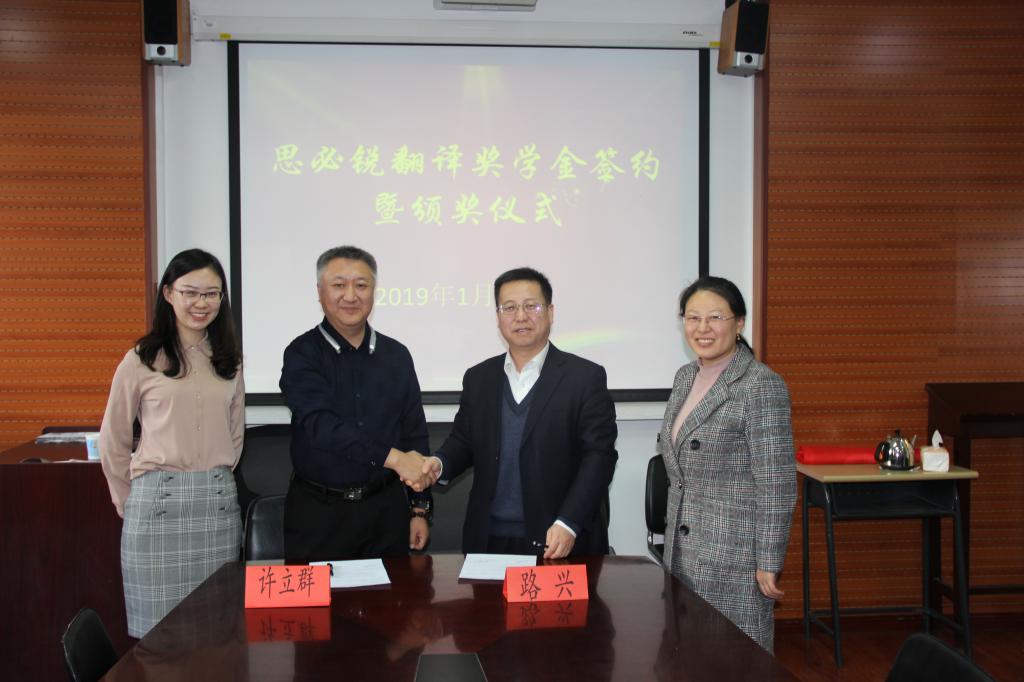 2019年1月4日上午10:00,我院在115会议室举行“思必锐翻译奖学金”签约暨颁奖仪式。北京思必锐翻译有限责任公司副总经理许立群、人力资源部经理魏之洲、资源管理部经理王艺露、培训部项目经理刘雅堃,米兰milan官方网站党总支书记路兴、辅导员张春霞、鞠丹、于承杰、王书剑,获奖学生刘欣然、张安莹、范柳依、潘越等参加了活动。