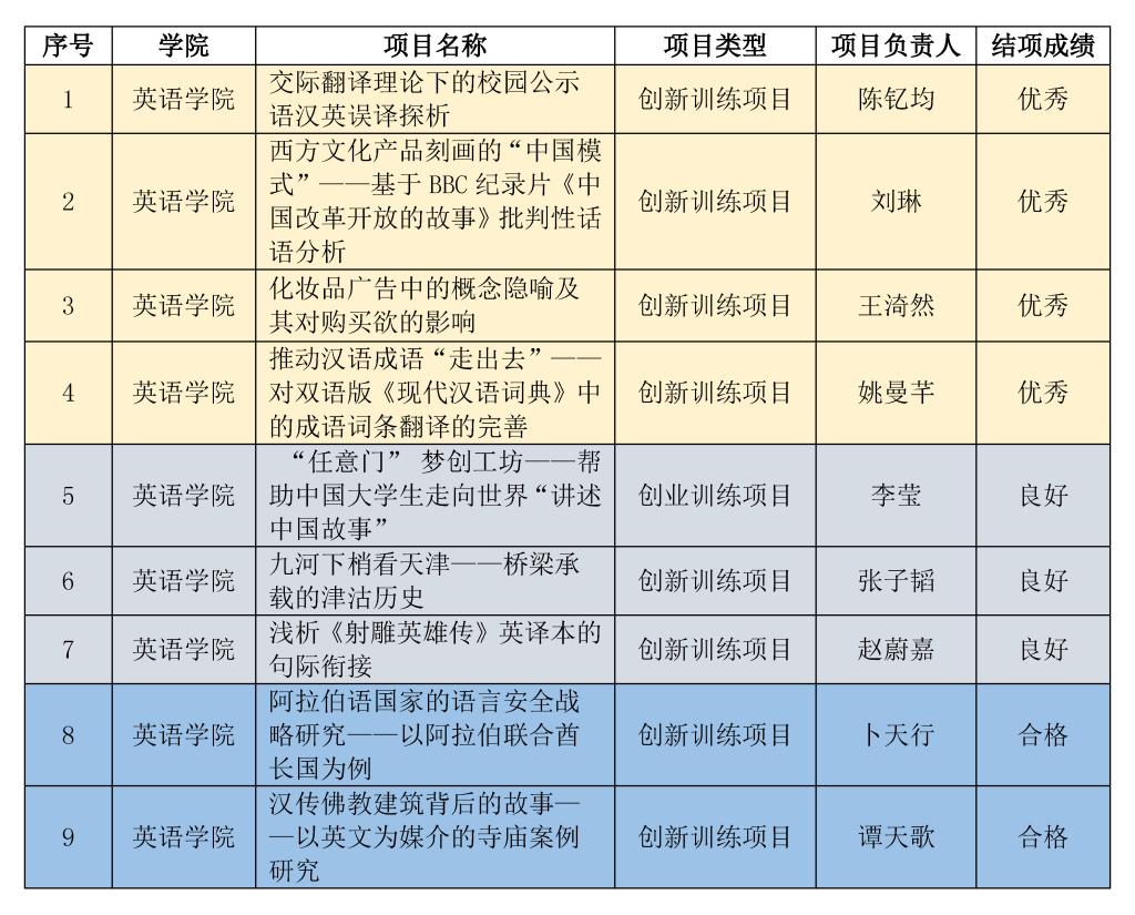 根据《关于“国家级大学生创新创业训练计划”项目2020年度结项工作的通知》,学校开展了国家大学生创新创业训练计划项目结题验收工作,并11月4日(周三)下午14:00在逸夫楼进行了结项评审工作。全校参与本次结项的项目共46个,经过材料评审、结项答辩等环节,共确定优秀项目8个,良好项目20个,合格项目18个。其中我院本科生申报的9个项目中获评优秀项目4个、良好项目3个、合格项目2个。具体如下表: