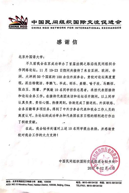 ——近日,中国民间组织国际交流促进会向我校发来感谢信,对我校杨镜洁、尹佩璇等10名同学在首届丝绸之路沿线民间组织合作网络论坛中的志愿工作表示感谢。