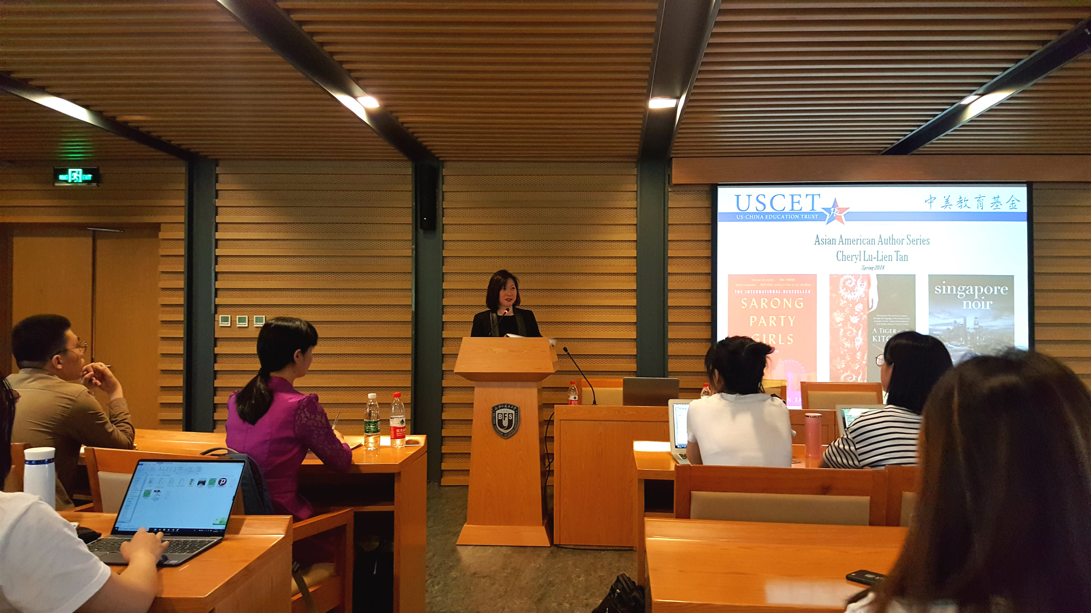 ——2018年5月11日,新加坡华裔作家Cheryl Lu-Lien Tan 女士在北外图书馆三层学术报告厅为北外师生做了一场题为“亚裔美国作家作品系列:向世界讲述中国故事”的精彩讲座。生长于新加坡的Cheryl Lu-Lien Tan目前为常驻纽约的记者与作家,她曾为《华尔街日报》等多家著名报社的特约撰稿人,并著有Sarong Party Girls和A Tiger in the Kitchen: A Memoir of Food & Family等畅销书籍。Tan女士主要围绕其第二本书展开演讲。她首先讲述了自己的成长经历,之后结合该书内容分享了关于家人、美食、故乡的回忆与感悟。Tan的风趣幽默的讲述,令现场观众开心不已并引发共鸣。在问答环节,Tan女士就写作技巧、亚裔作家群体情况、华裔身份与新加坡女性地位等方面与现场师生进行了互动。此次讲座由中美教育基金(US-China Education Trust),北外美国信息中心(InfoUSA@BFSU)、美国研究中心和华裔美国文学中心共同举办,翟峥老师和刘葵兰老师组织安排,刘葵兰老师主持,付美榕、周炜、李今朝老师出席了讲座。