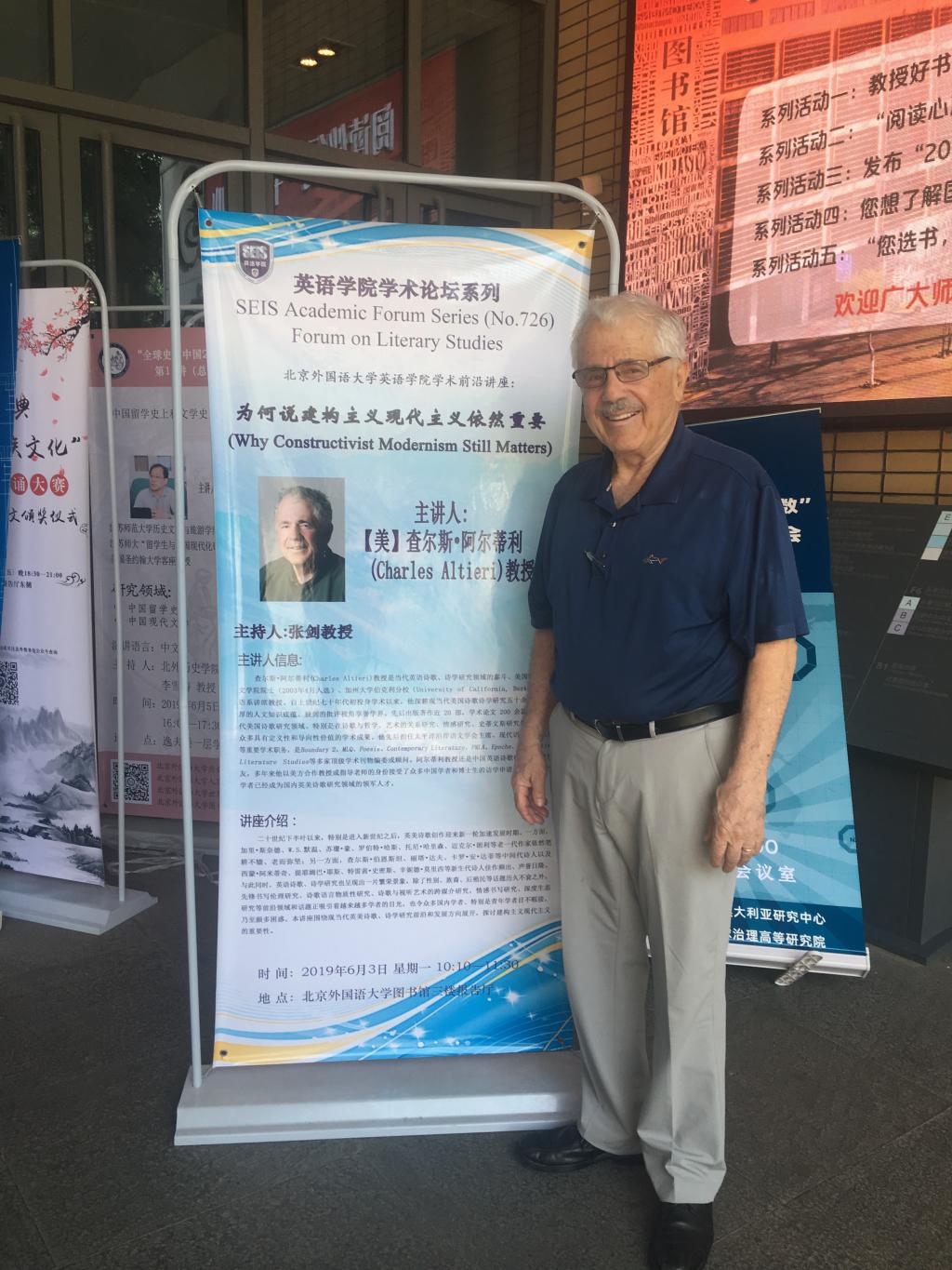 2019年6月3日上午10:10-11:30,加州大学伯克利分校英语系讲席教授查尔斯·阿尔蒂利(Charles Altieri)教授在北京外国语大学图书馆三楼报告厅做了题为“为何说建构主义现代主义依然重要”(Why Constructivist Modernism Still Matters)的学术报告。张剑教授主持了报告会,来自北京外国语大学、北京师范大学、北京联合大学等高校的师生50人参加。