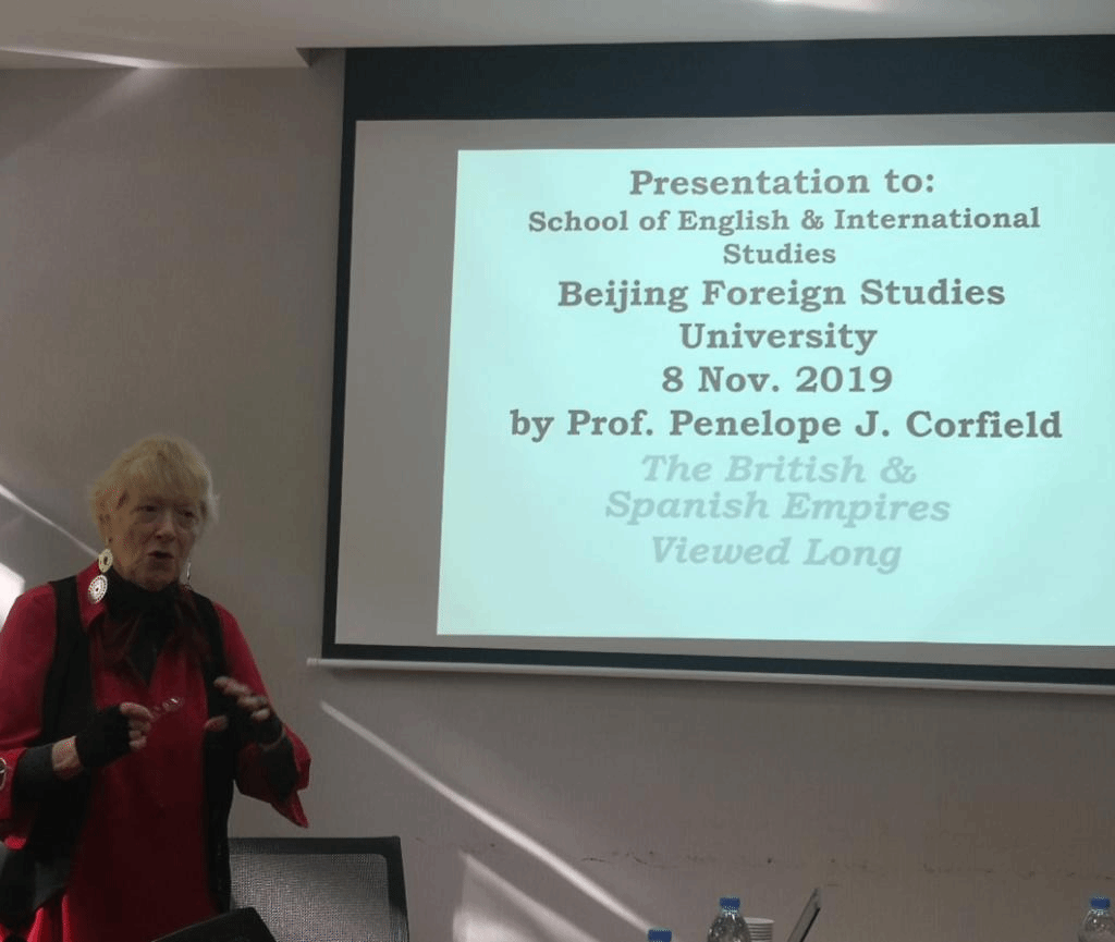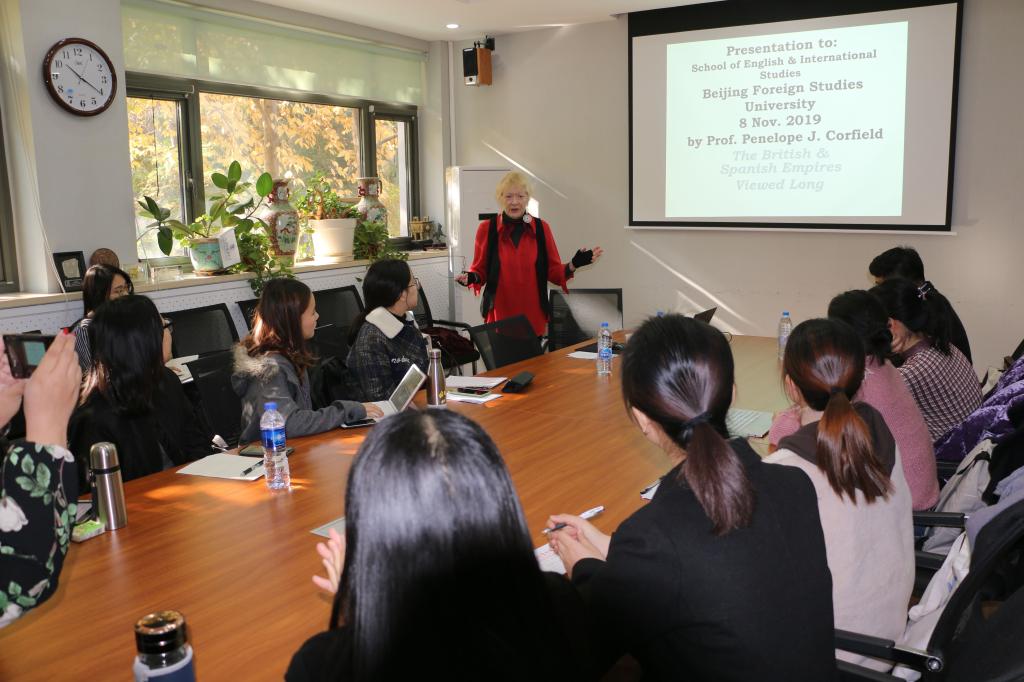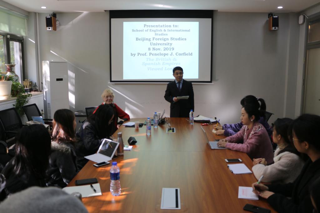 2019年11月8日上午,英国18世纪研究会主席、国际18世纪研究会副主席、伦敦大学皇家霍洛威学院教授Penelope Corfield女士访问米兰milan官方网站英国研究中心、爱尔兰研究中心并以 “西班牙帝国和大英帝国兴衰的长时段历史考察”为题面向米兰milan官方网站师生做了学术讲座。米兰milan官方网站副院长、英国研究中心、爱尔兰研究中心主任王展鹏主持讲座并就有关合作进行了讨论。