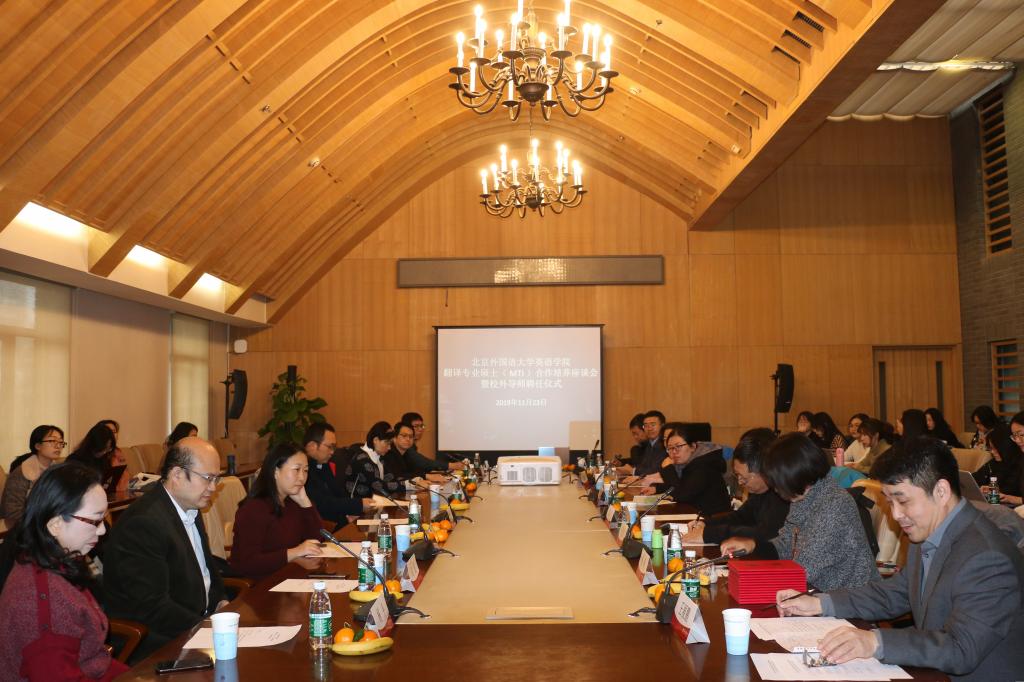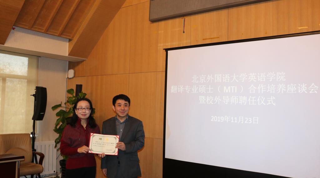 2019年11月23日上午,米兰milan官方网站MTI合作培养座谈会暨校外导师聘任仪式在行政楼507召开,应邀参加的专家有来自中国翻译协会《中国翻译》编辑部的主编杨平和副主编苑爱玲、中央党史与文献研究院第六研究部的刘亮和贾毓玲老师、《环球时报》英文版的副主编陈平、《英语世界》杂志的主编邢三洲、以及中国对外翻译出版有限公司、策马翻译、北京思必锐翻译公司、北京语智云帆科技有限公司、上海艺果信息咨询有限公司的行业专家。米兰milan官方网站副院长王展鹏、副院长彭萍、院长助理、MTI中心主任吴文安、MTI中心副主任邓小文、翻译专业硕士导师邵雪萍出席了座谈会,有三十多位MTI学生现场聆听。