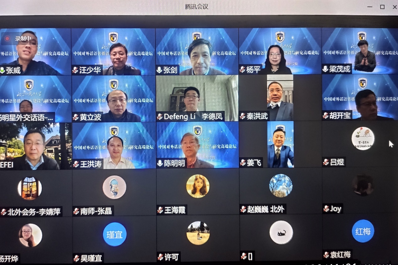 下午圆桌论坛阶段,南京师范大学汪少华教授、曲阜师范大学秦洪武教授、上海外国语大学鲍晓英教授、西安外国语大学黄立波教授,以及北京外国语大学高金萍教授、王洪涛教授、张威教授,集中讨论了中国特色对外话语体系在英语世界翻译与传播的语料收集、概念界定、翻译评价、传播分析等问题,明确了下一步工作重点。随后,与会专家和参与论坛的硕士生、博士生交流了关于对外话语翻译与传播的相关研究话题和设计方法,明确了该研究领域的主要内容和方法策略。同时,上午主旨发言人也利用腾讯会议信息、微信、电话等形式,参与了下午的讨论交流。