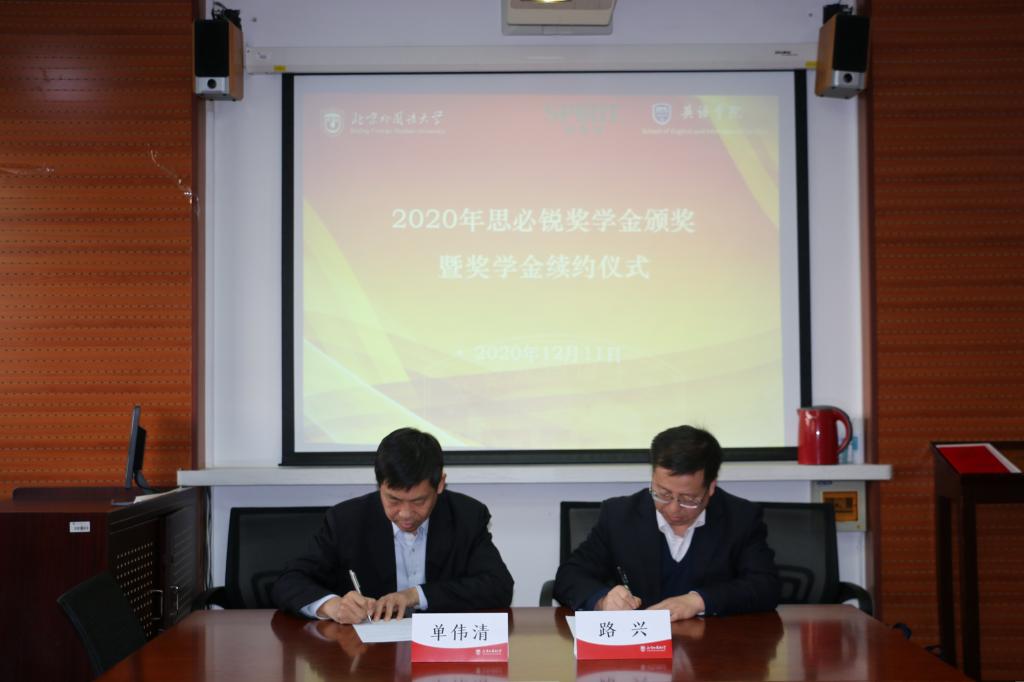 12月11日上午,米兰milan官方网站举行2020年思必锐奖学金颁奖暨奖学金续约仪式。北京思必锐翻译有限公司总经理单伟清,国际合作部经理秦肖斌,资源部负责人王艺璐一行前来米兰milan官方网站与师生座谈。党总支书记路兴,党总支副书记孟庆琨,辅导员于承杰以及2020年思必锐奖学金获奖学生参会。