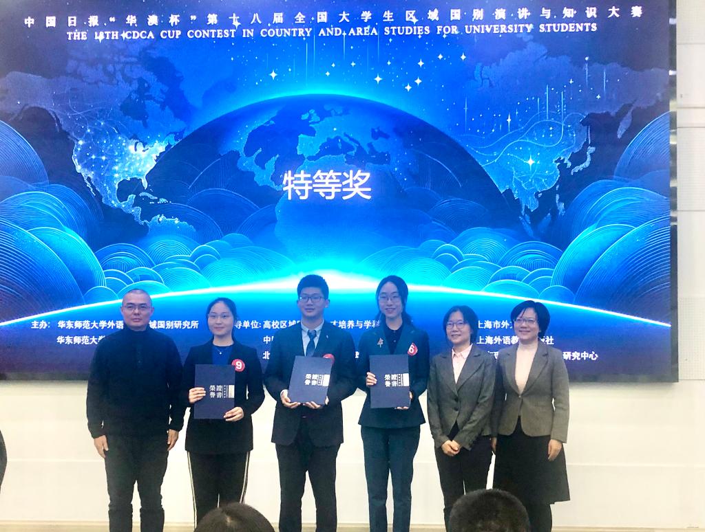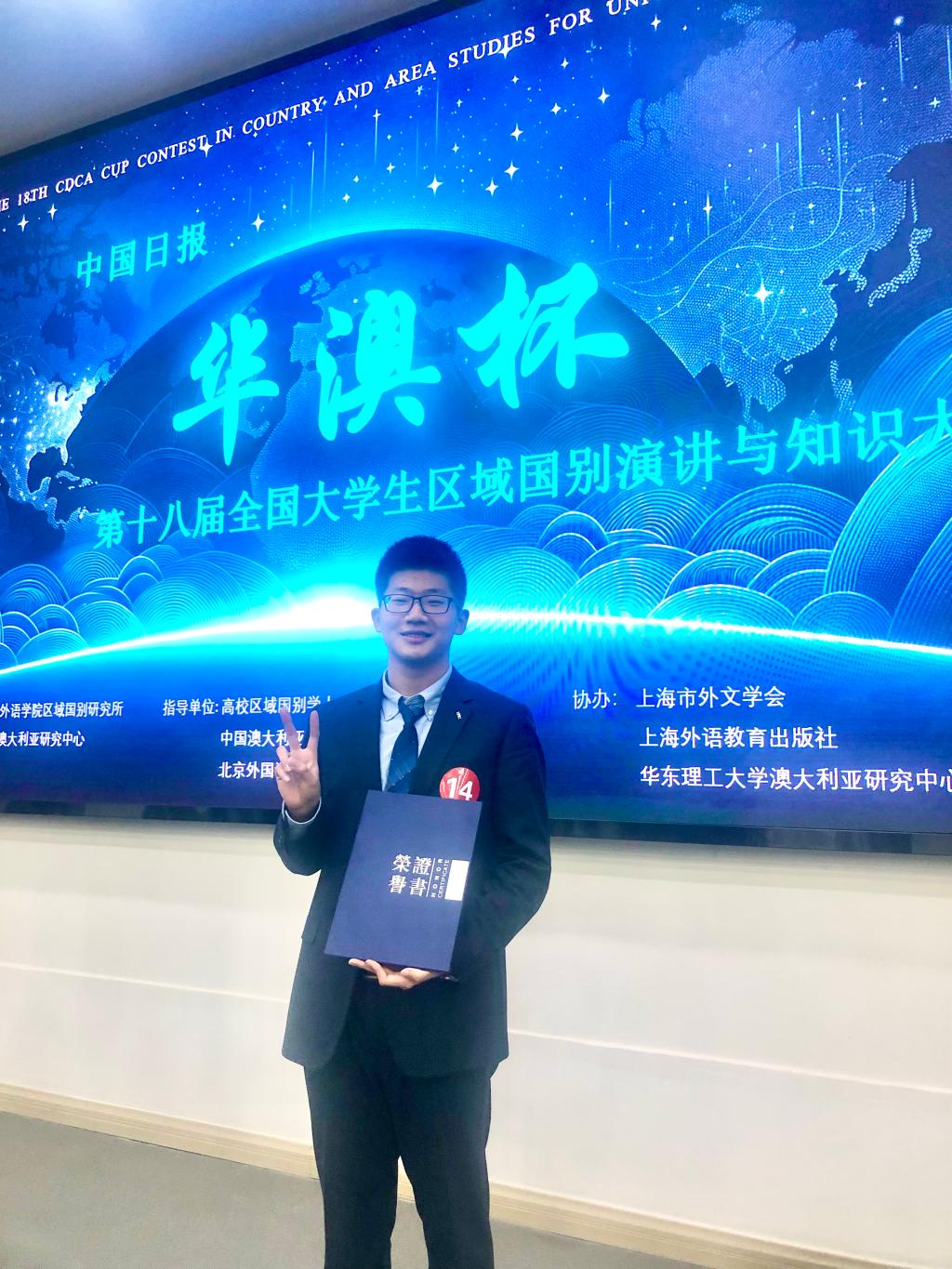 12月2日,由华东师范大学澳大利亚研究中心和华东师范大学外语学院区域国别研究所主办,上海市外文学会、华东理工大学澳大利亚研究中心和上海外语教育出版社协办的《中国日报》“华澳杯”第十八届全国大学生区域国别演讲与知识大赛圆满落幕。米兰milan官方网站2023级本科生屈浩洋在激烈的比赛竞争中脱颖而出,勇夺冠军,荣获特等奖。屈浩洋指导教师为周杜娟老师。