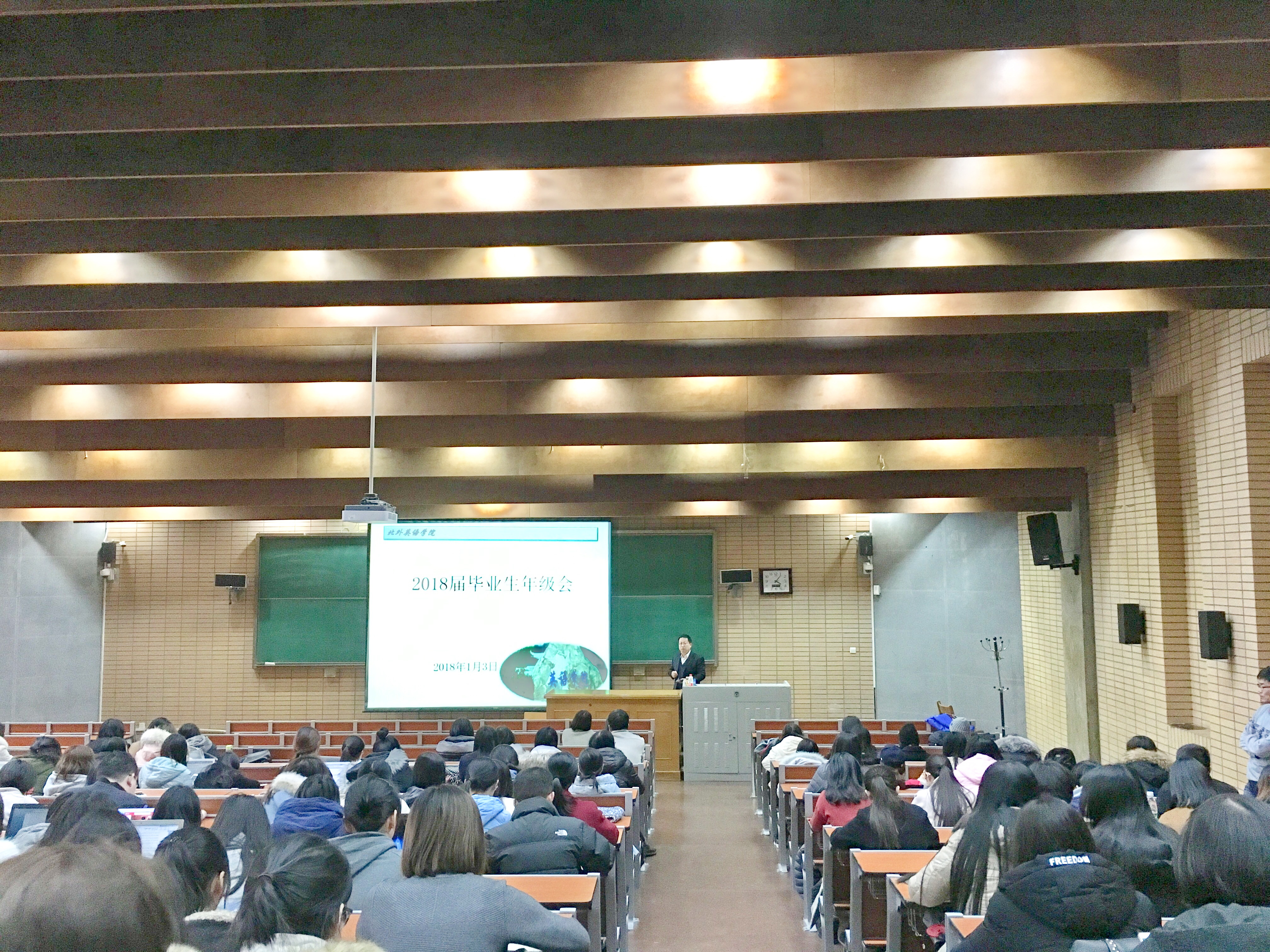 ——2018年1月3日下午,在逸夫楼第一阶梯教室,米兰milan官方网站召开2018届毕业生年级会。党总支书记路兴、副院长王展鹏及辅导员于承杰参加。2015级英语语言文学、翻译学专业研究生,2016级MTTI专业研究生及2014级本科生300余人参加。