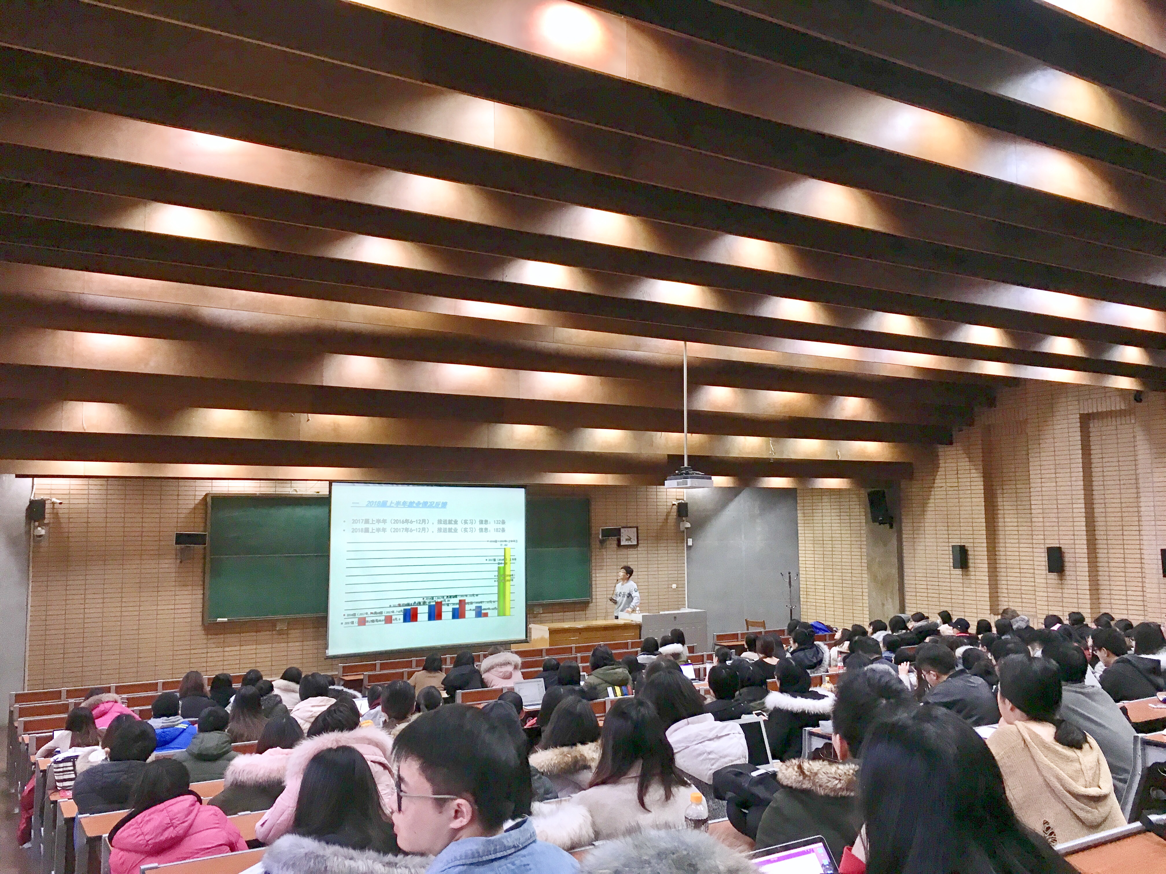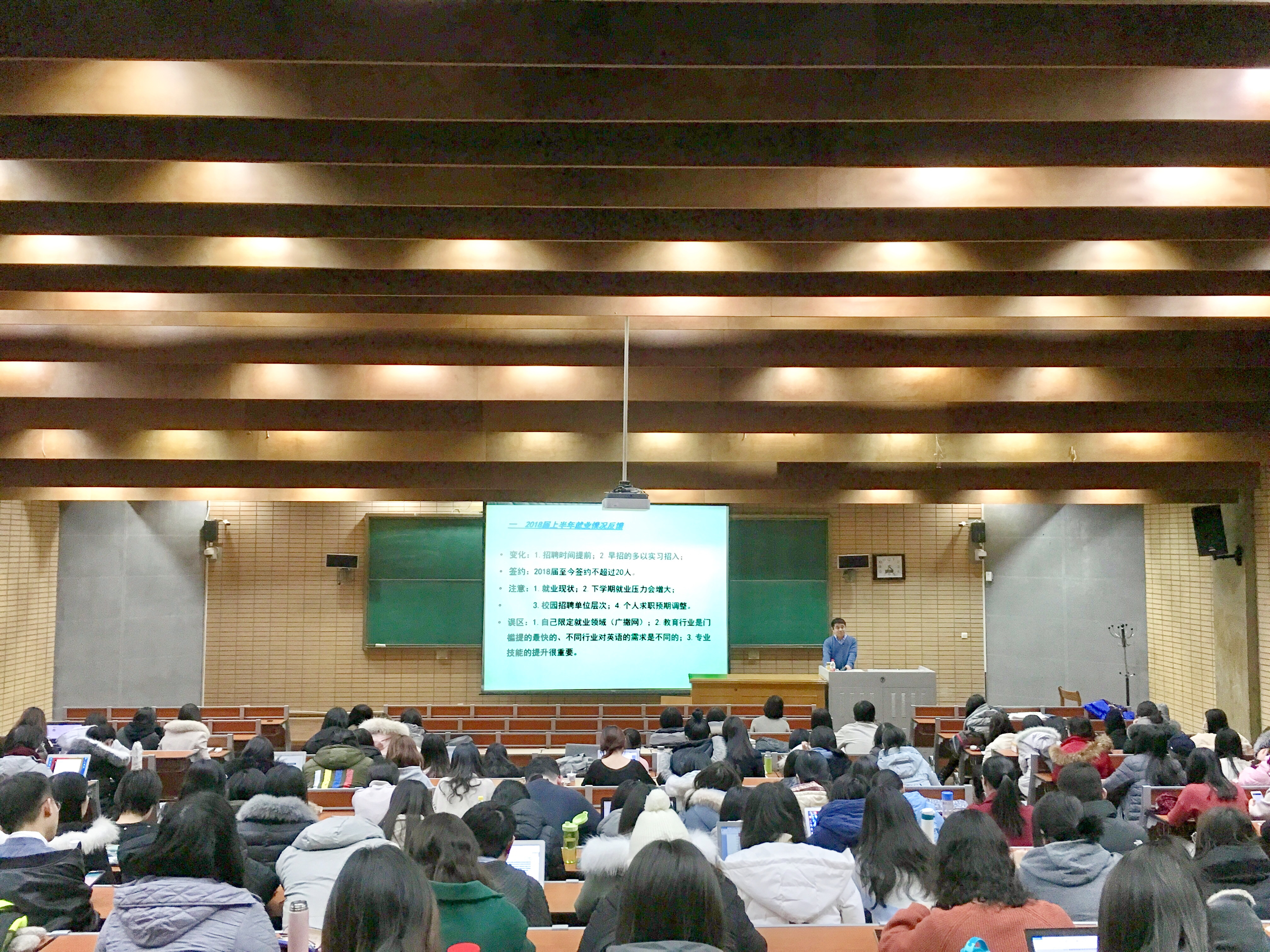 ——随后于承杰老师就学生关心的几个问题进行了回复。一是2017年下半年校园招聘及2018届毕业生签约进度。二是毕业生签约及离校流程。三是下学期涉及到的几项工作及主要的时间节点。四是假期安全问题。于老师注重强调同学们应根据上学期的校园招聘情况,务实、合理的调整自己的求职预期,在下学期合理安排时间,协调好论文答辩与求职的关系,务必在离校之前最终确定就业去向。临近寒假,希望同学们无论出行还是在校,务必注意人身安全、财物安全。
