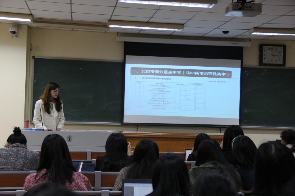 接着,张春霞老师向大家介绍了目前2019年就业工作的进展情况,对已毕业学生的就业岗位进行了详细介绍,包括公务员岗位(如外交部、商务部、选调生等), 学校事业单位岗位(如人大附中分校、外研社、新华社等),企业岗位(北方装备、学而思、网易等),考博或自由职业。进而,张老师对2019年的就业特点进行了分析,如进京落户指标依然紧缺,央企、国企、事业单位用人数量紧缩,民企、私企成为就业主力军,新兴互联网公司、英语线上培训机构成为新的就业力量等。